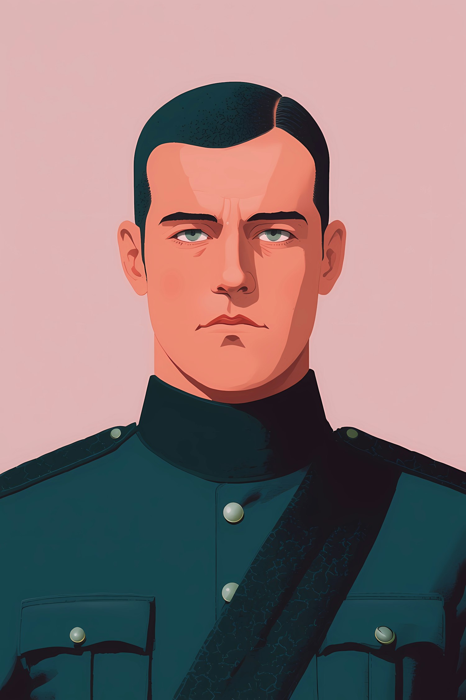 Stylized illustration of a man in a dark blue military-style uniform against a light pink background, showcasing clean lines and bold colors.