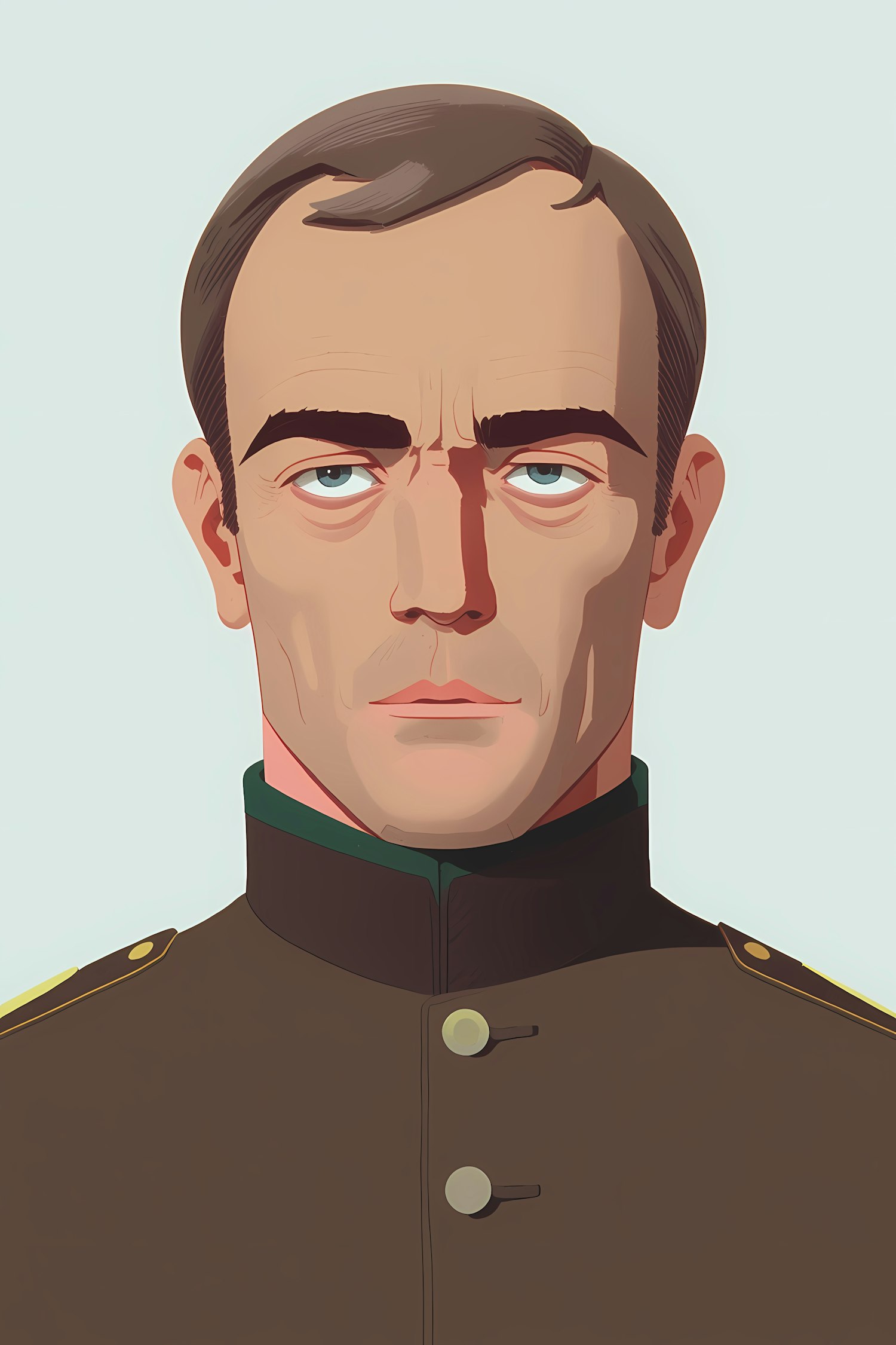 Stylized illustration of a man in a military uniform with a serious expression, featuring clean lines and a modern artistic style.
