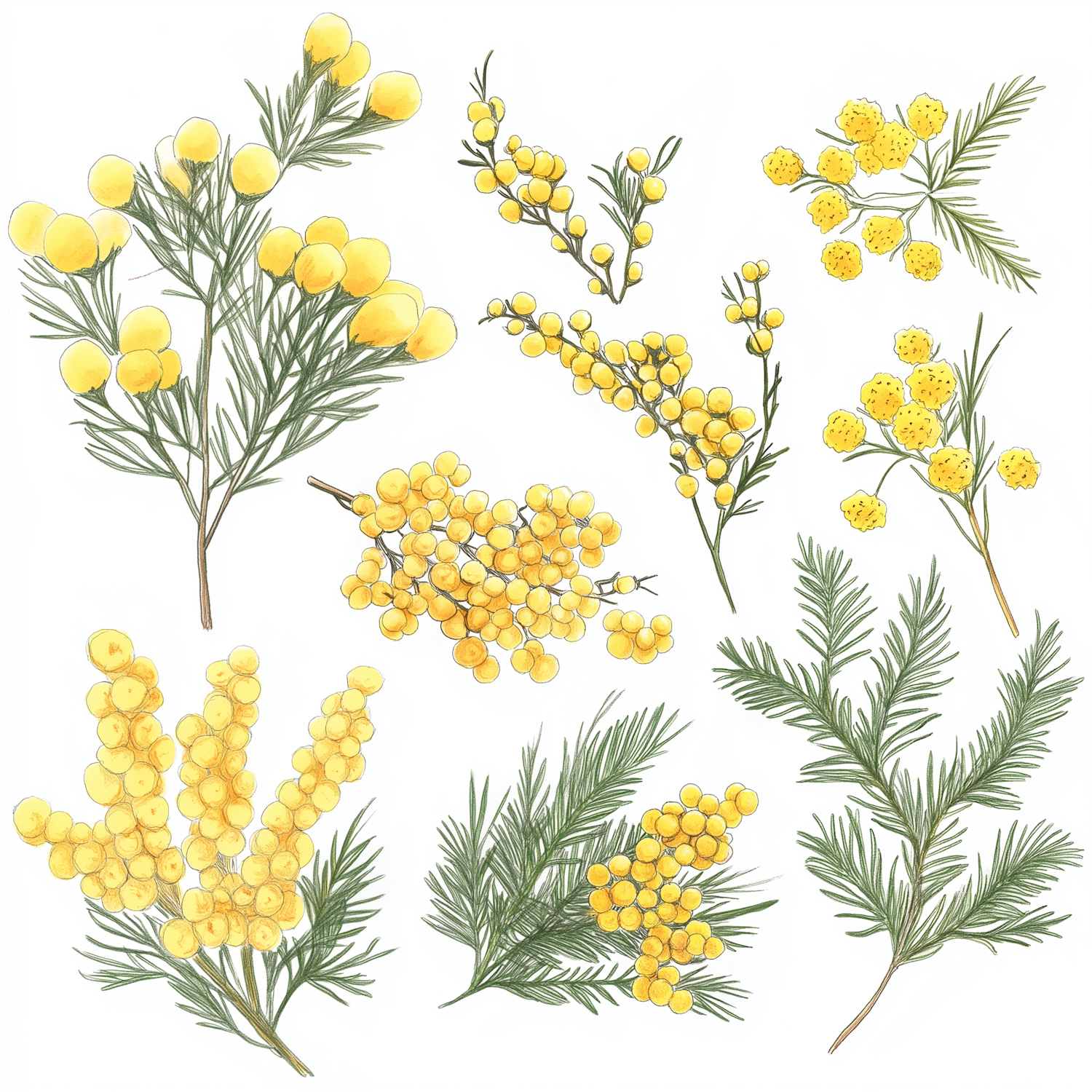 Delicate botanical illustration of mimosa flowers with vibrant yellow blooms and feathery green leaves on a clean white background.