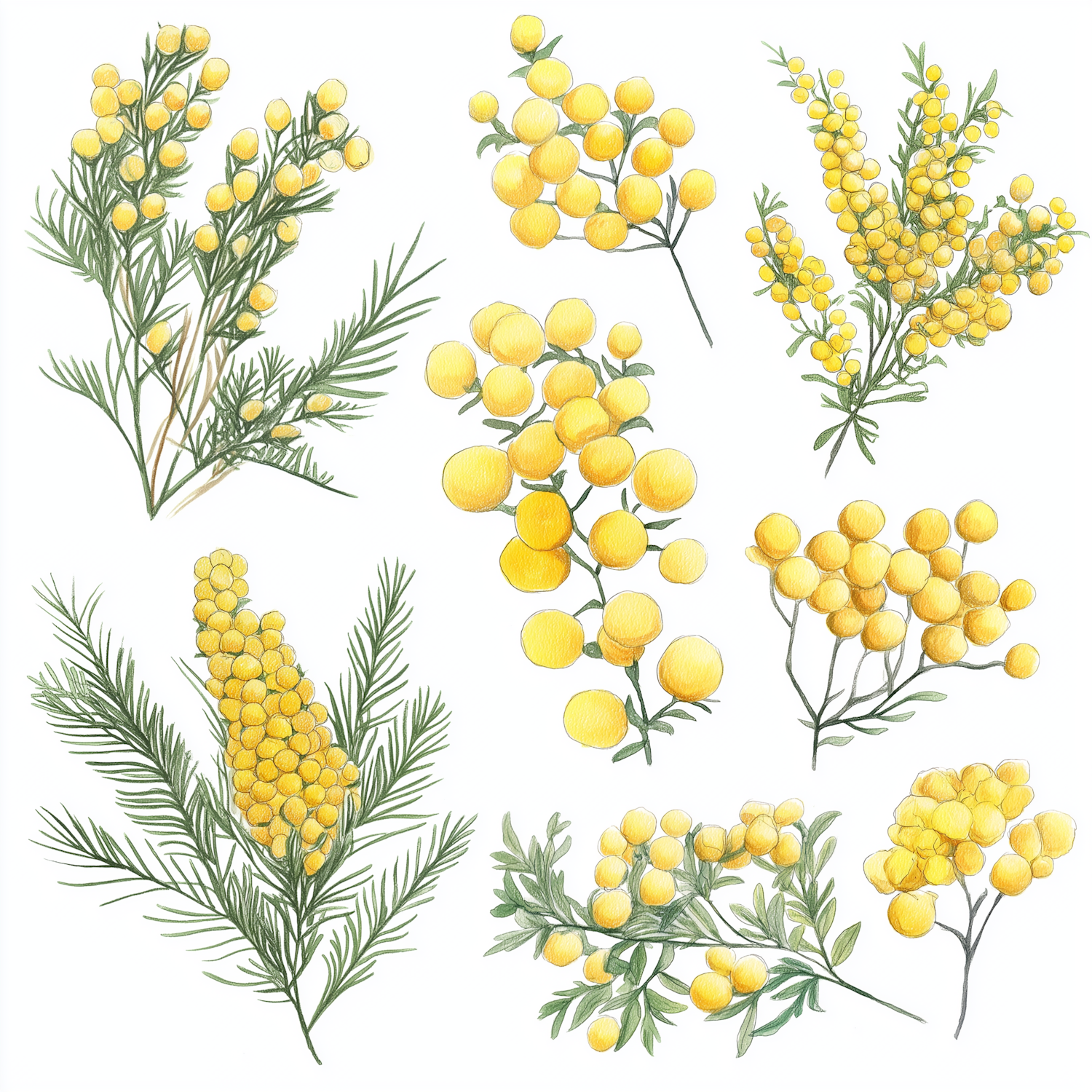 Beautiful botanical illustration of mimosa flowers with vibrant yellow blooms and feathery green leaves on a clean white background.