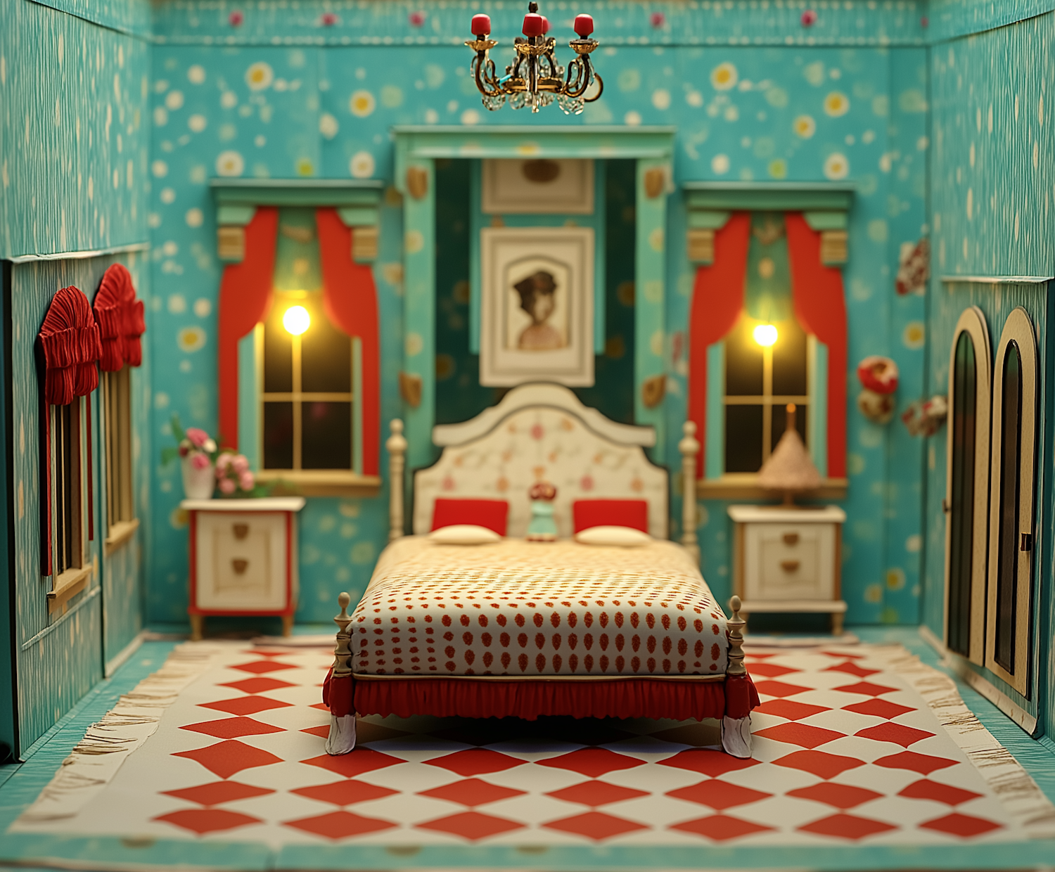 Charming miniature bedroom with turquoise walls, red accents, and a polka-dotted bedspread. Vintage decor and warm lighting create a cozy vibe.