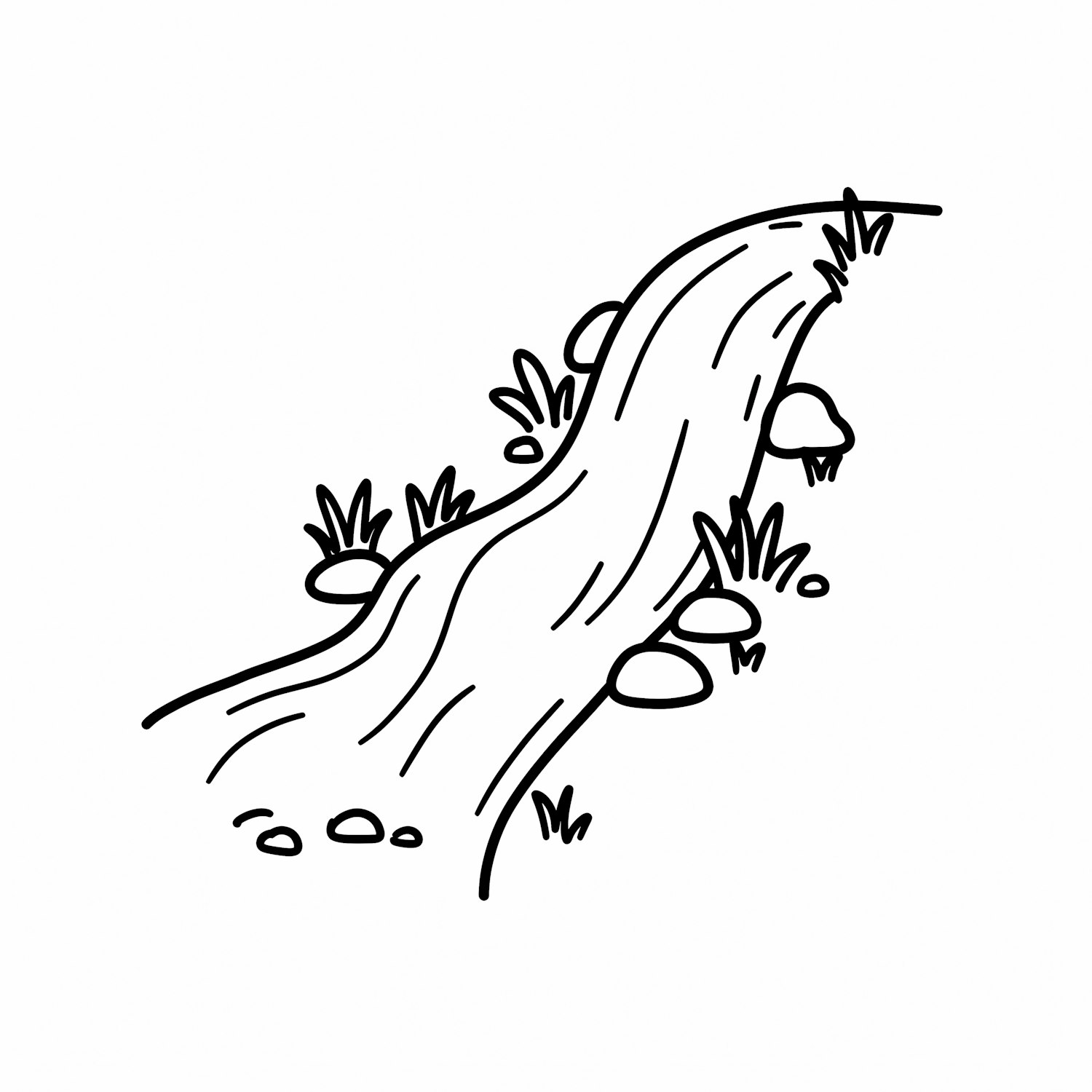 Minimalist black-and-white line art of a flowing stream with rocks and grass, showcasing a serene natural scene.