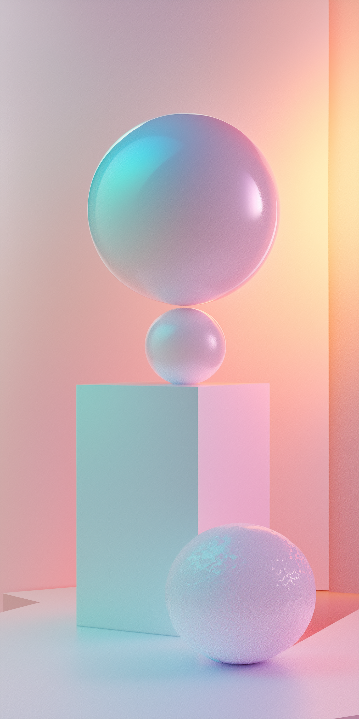 Minimalist 3D art with pastel spheres and a block, glowing in soft pink, blue, and orange gradient lighting.