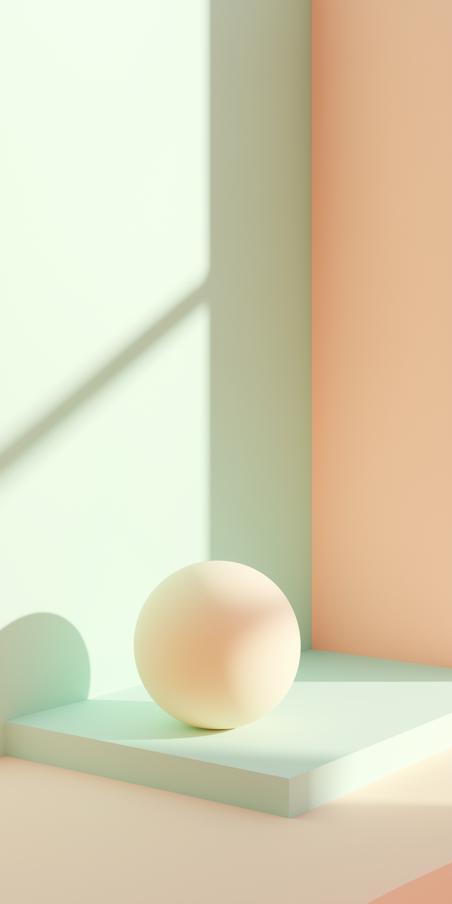 Minimalist 3D scene with a pastel sphere on a mint platform, surrounded by peach and mint walls with soft natural light shadows.