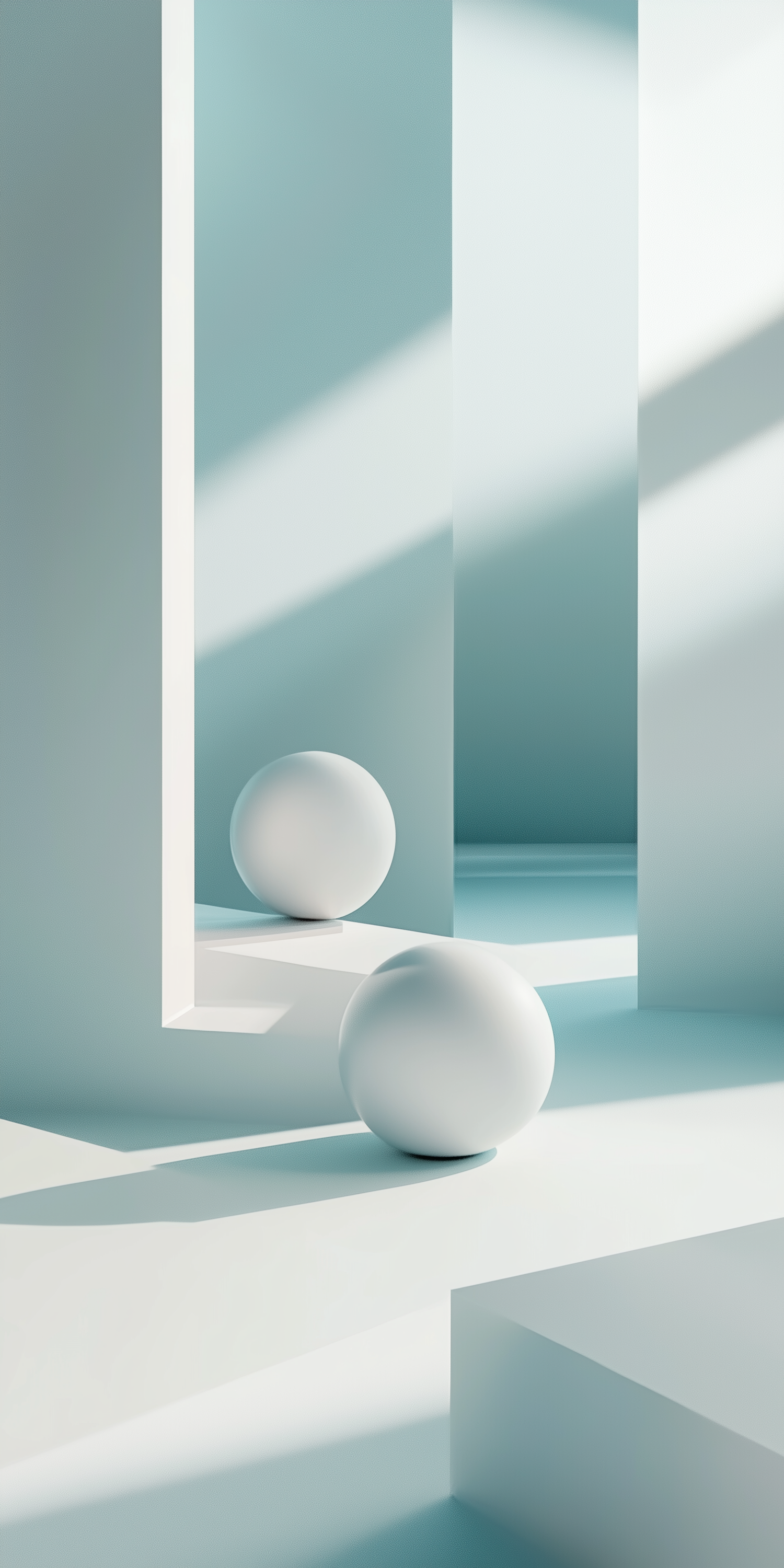 Minimalist 3D scene with white spheres on geometric platforms, soft pastel tones, and clean shadows creating a serene, modern vibe.