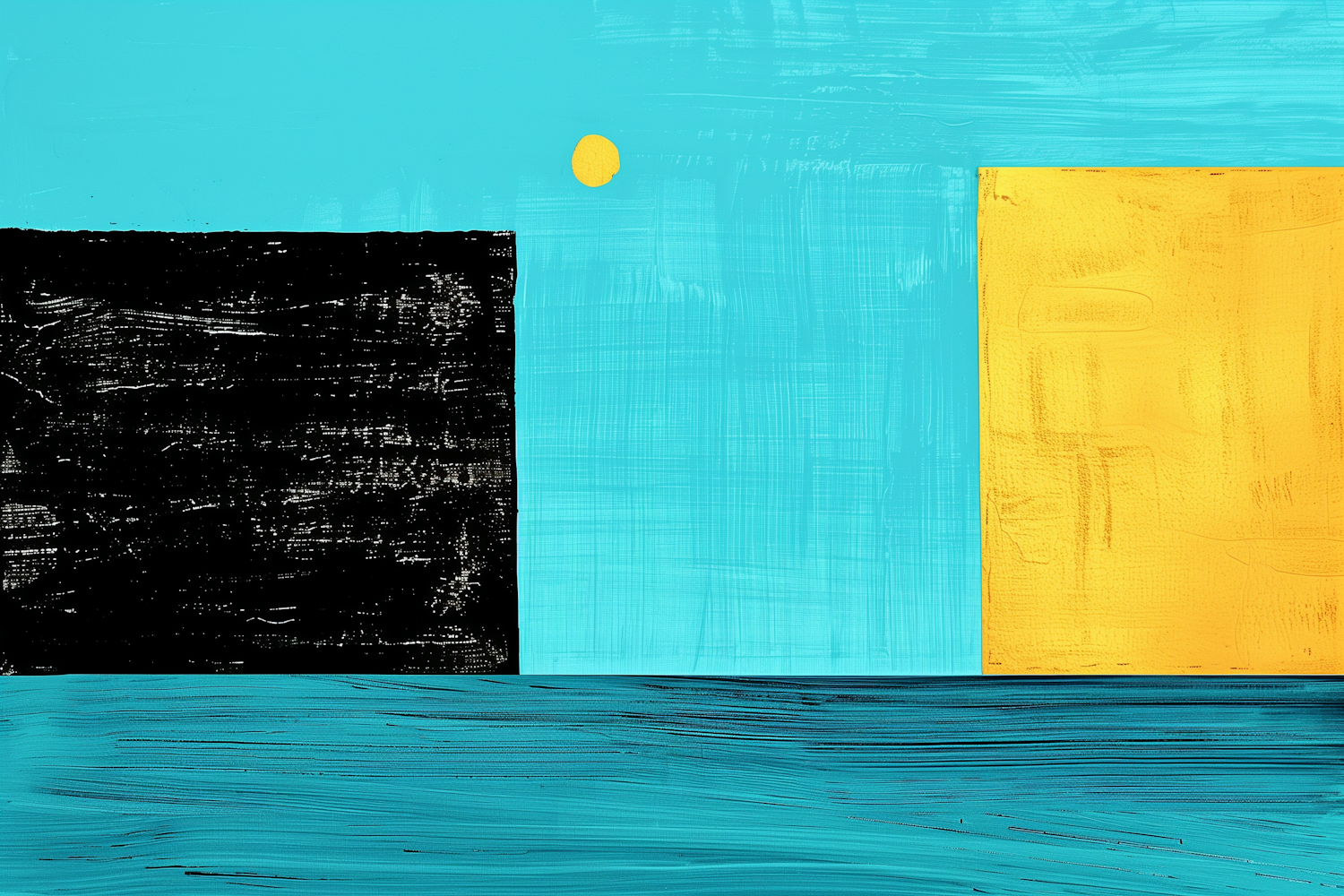 Abstract painting with turquoise, black, and yellow geometric shapes. Bold and modern design with textured surfaces.