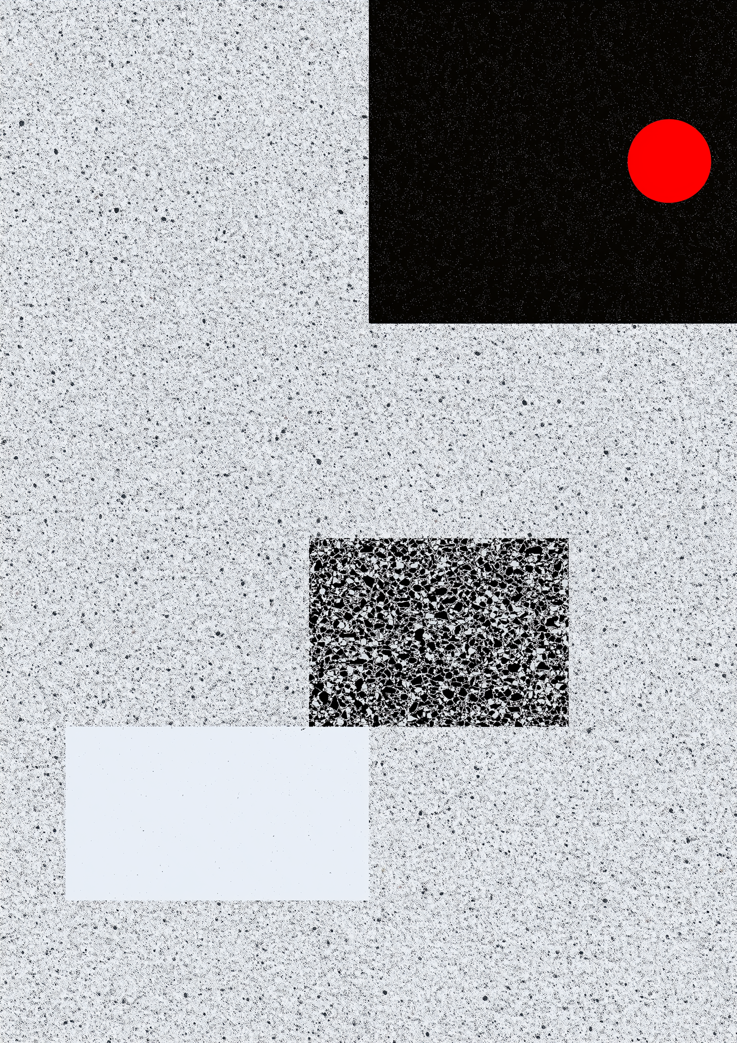 Abstract minimalist design with textured gray background, black and white rectangles, and a bold red circle for striking contrast.