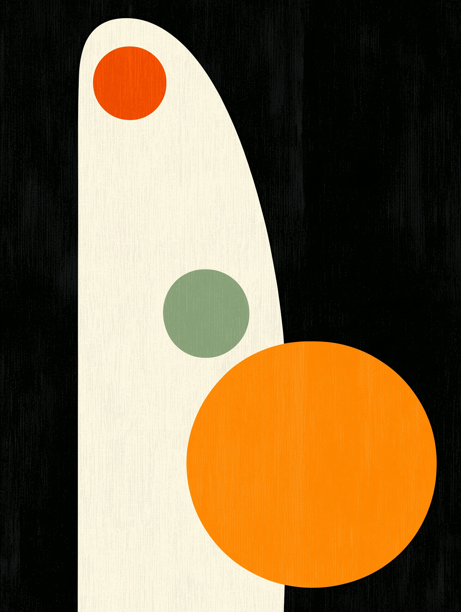 Abstract minimalist illustration with bold shapes and colors: white curve, red, green, and orange circles on a black background.