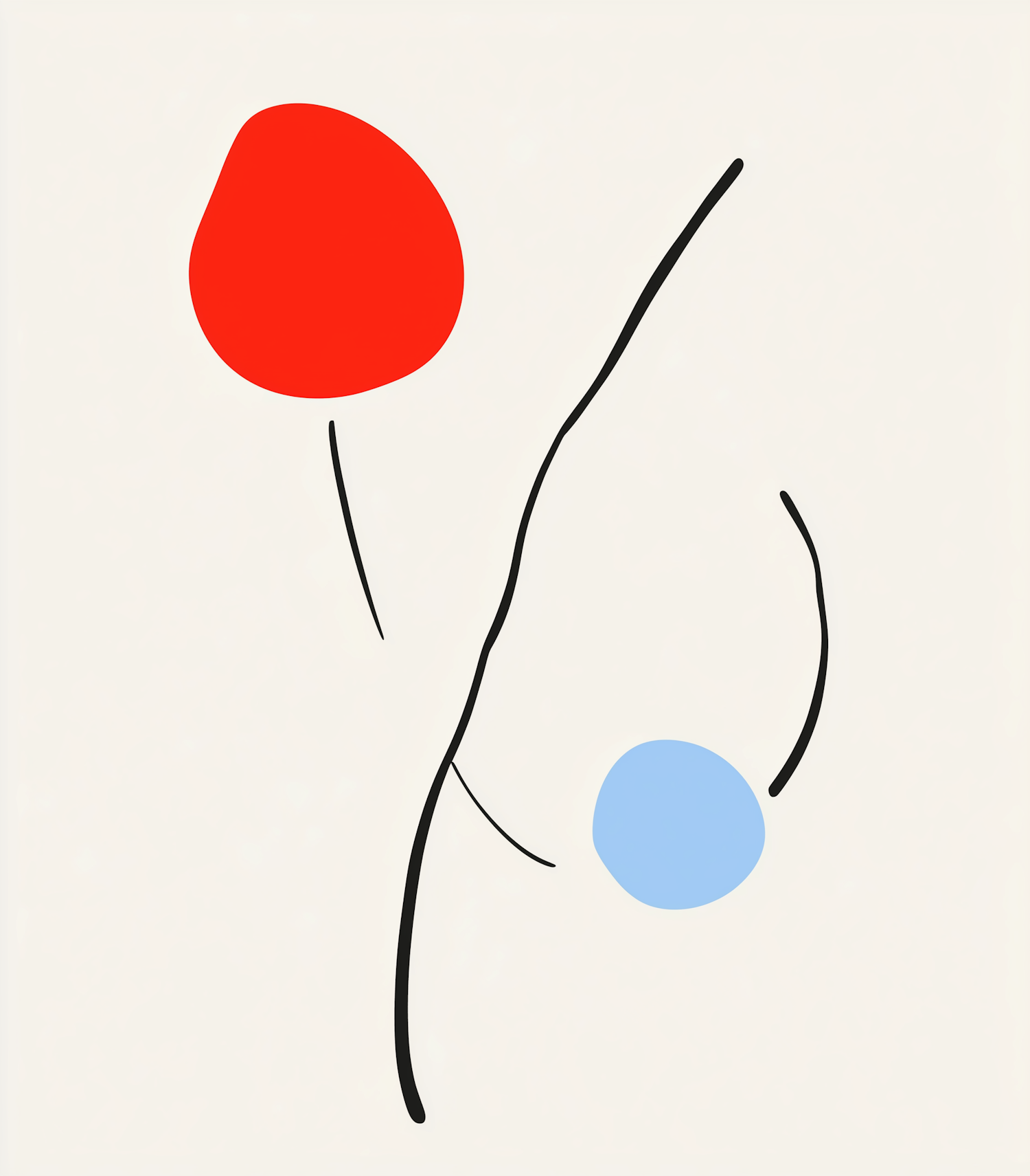 Minimalist abstract art with bold red and blue shapes connected by black lines on an off-white background.