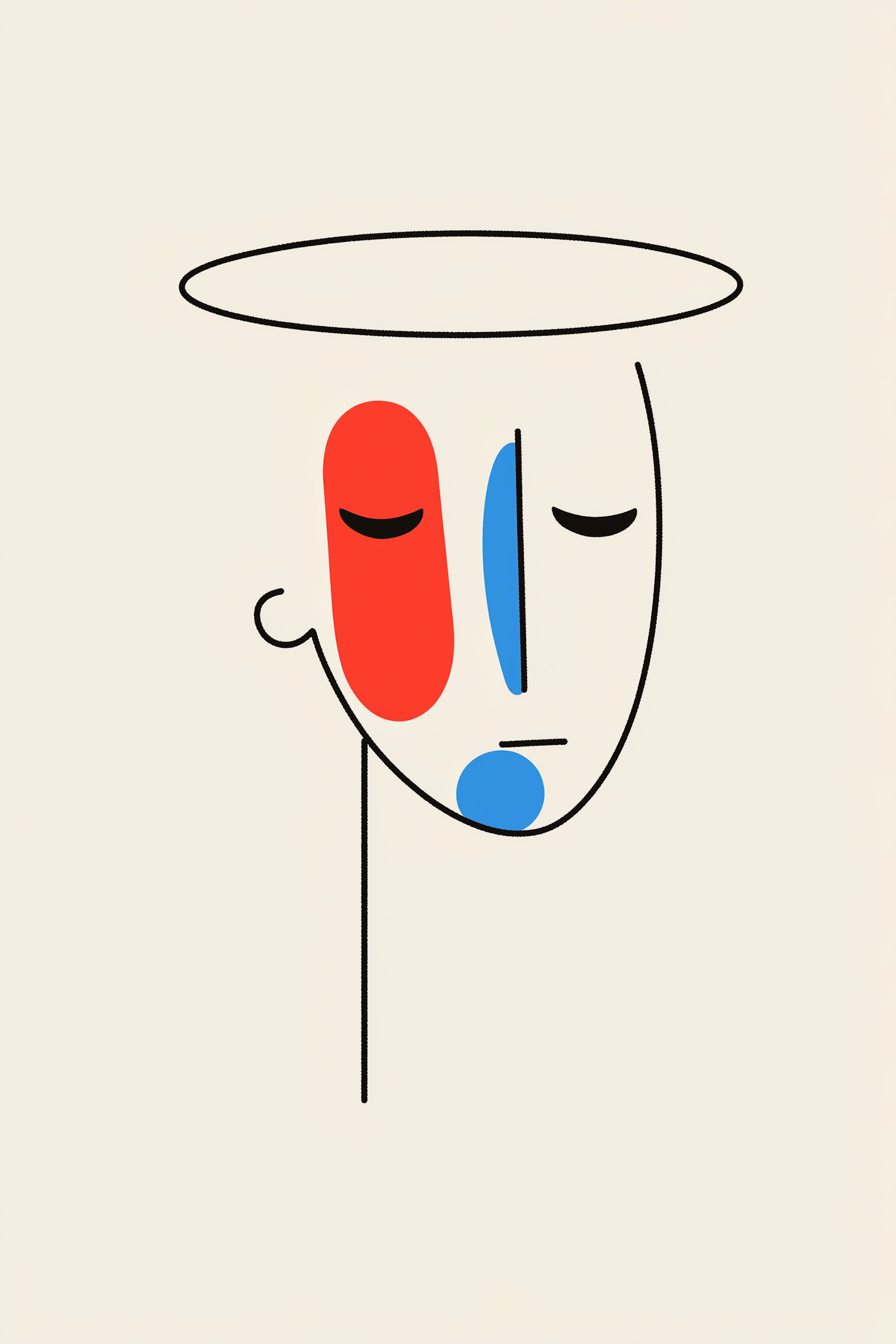 Minimalist abstract face illustration with red and blue accents on a beige background, featuring a serene expression.