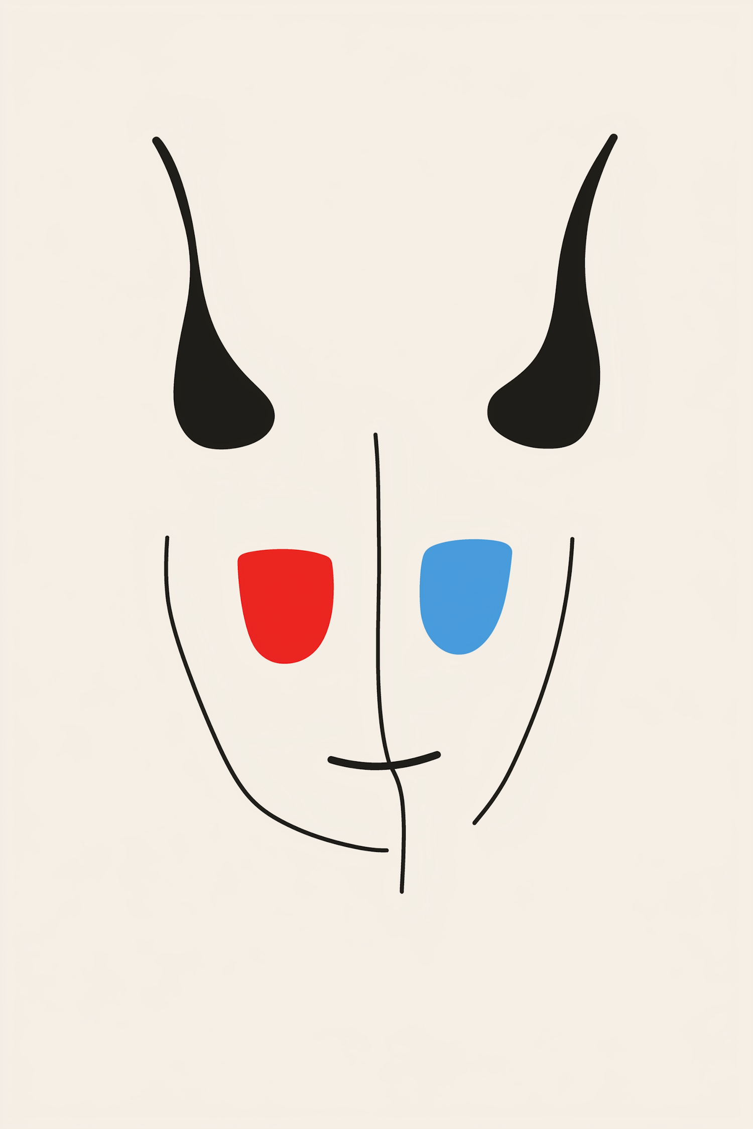 Minimalist abstract face illustration with red and blue eyes, black lines on beige background, creating a modern and playful design.