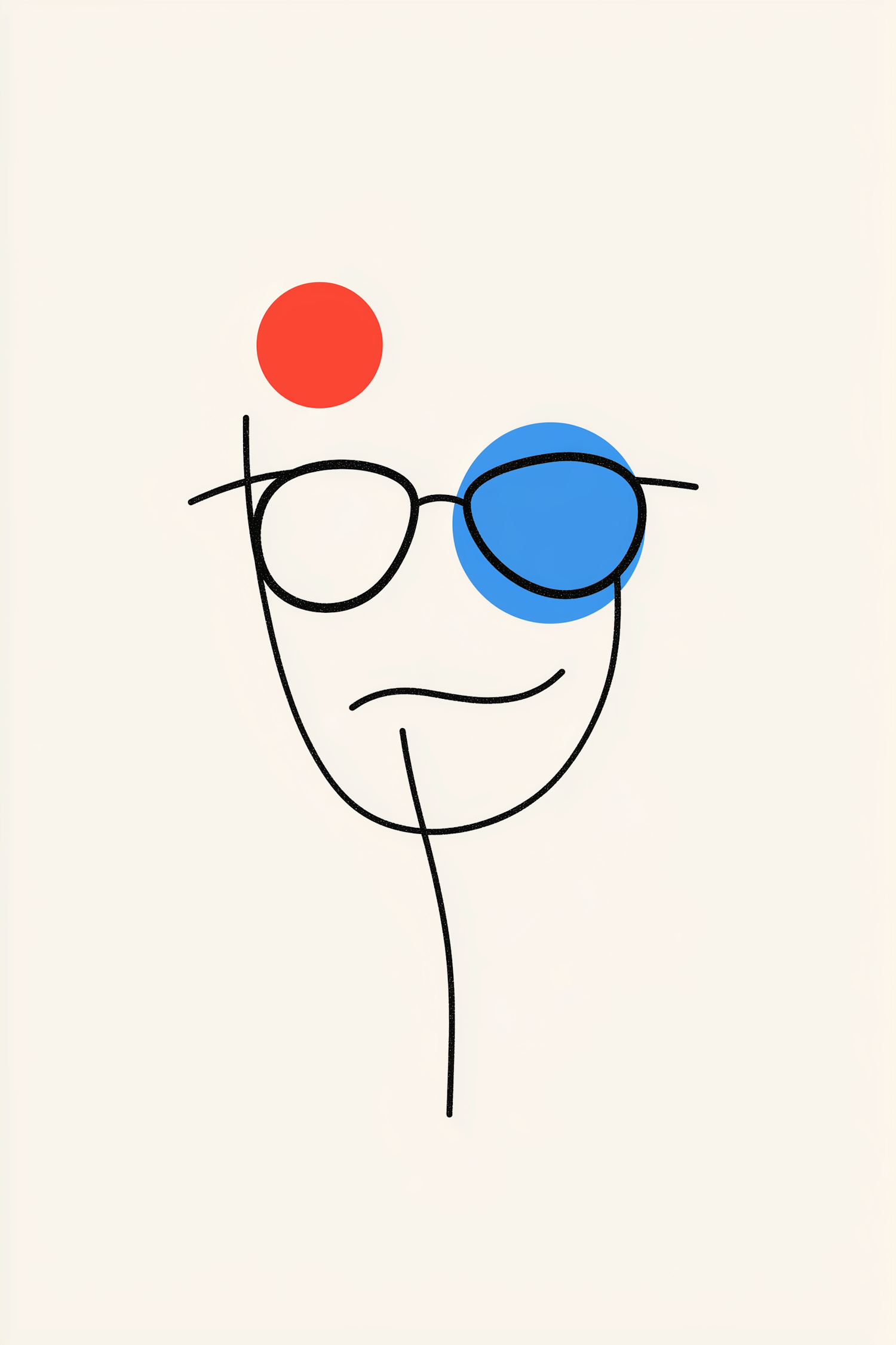 Minimalist abstract face illustration with red and blue circles on an off-white background.
