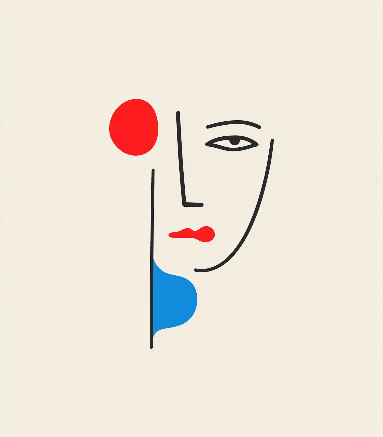 Minimalist abstract face illustration with bold lines, red and blue accents on a cream background.