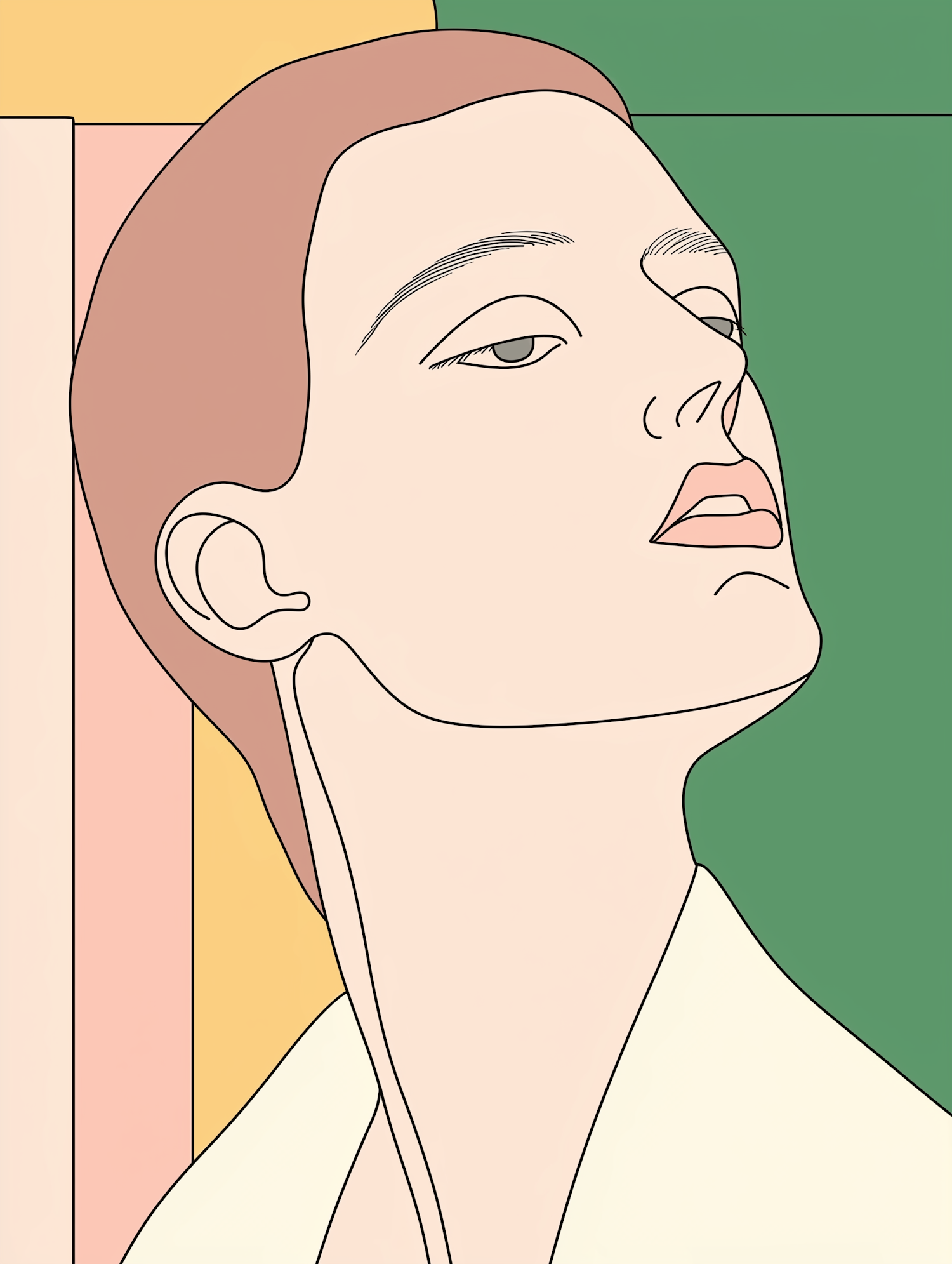 Minimalist illustration of a person with short hair, serene expression, and geometric color blocks in the background.