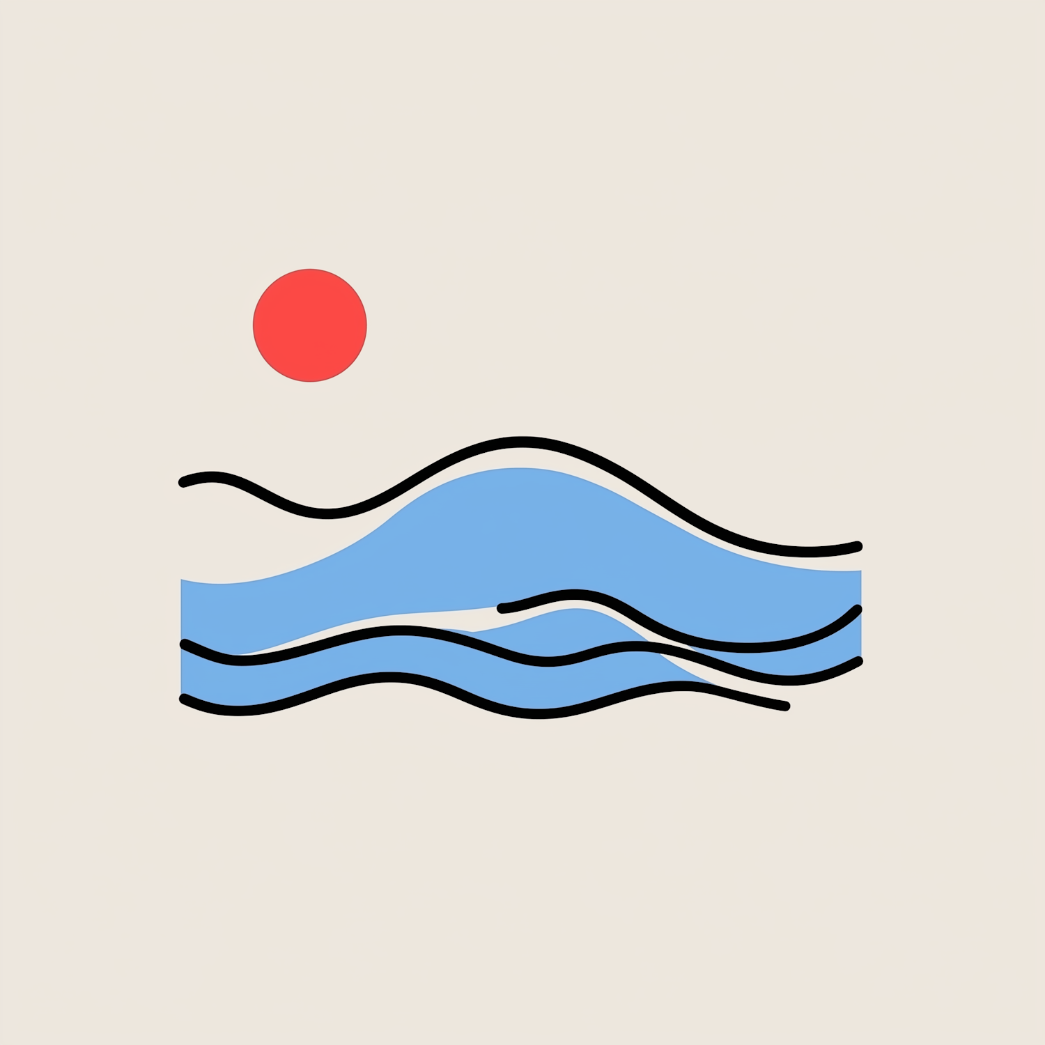 Minimalist ocean illustration with wavy lines and a red sun on a cream background, emphasizing simplicity and abstract design.