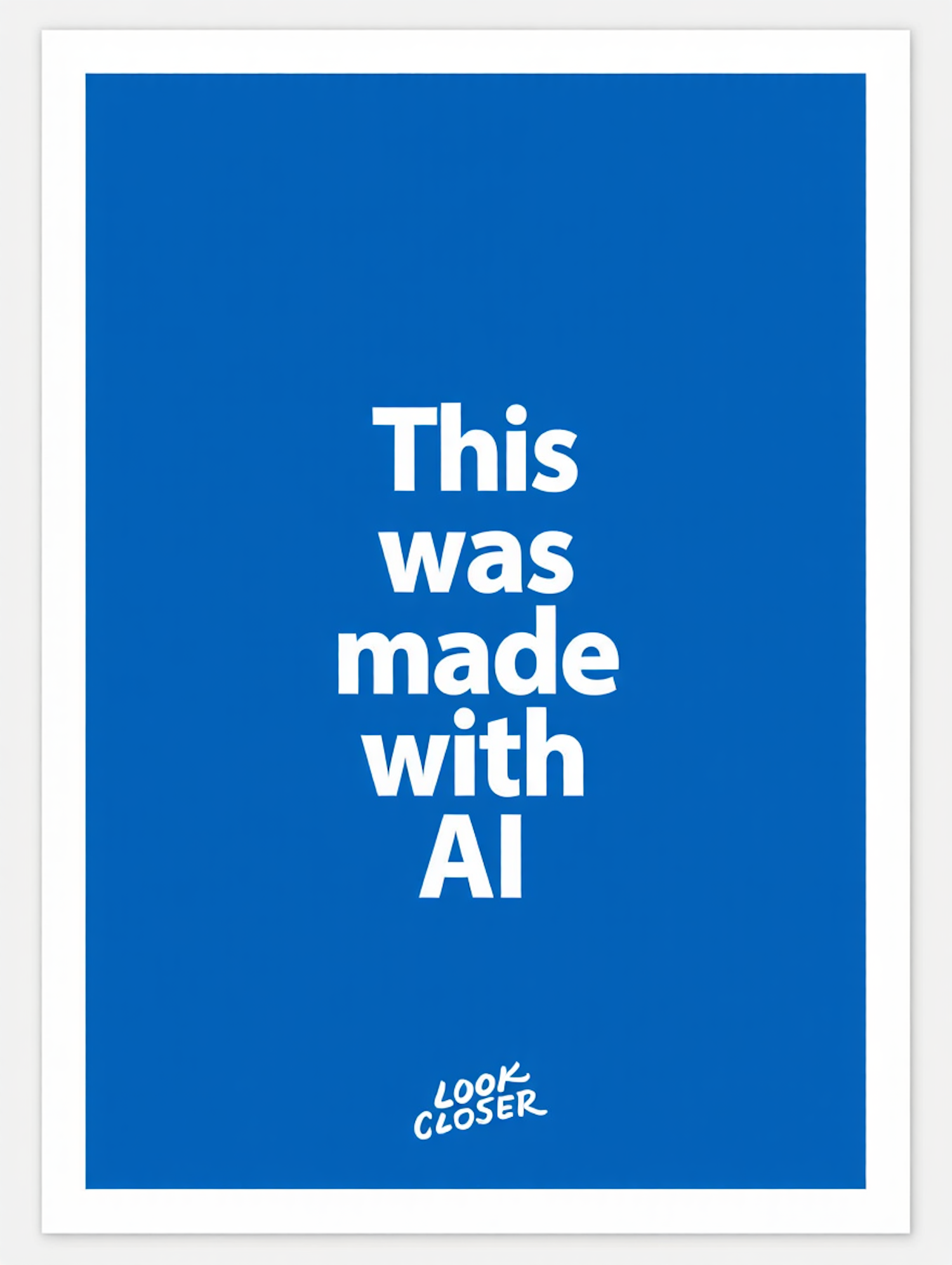 Minimalist blue and white design with bold text stating 'This was made with AI' and a handwritten 'LOOK CLOSER' at the bottom.