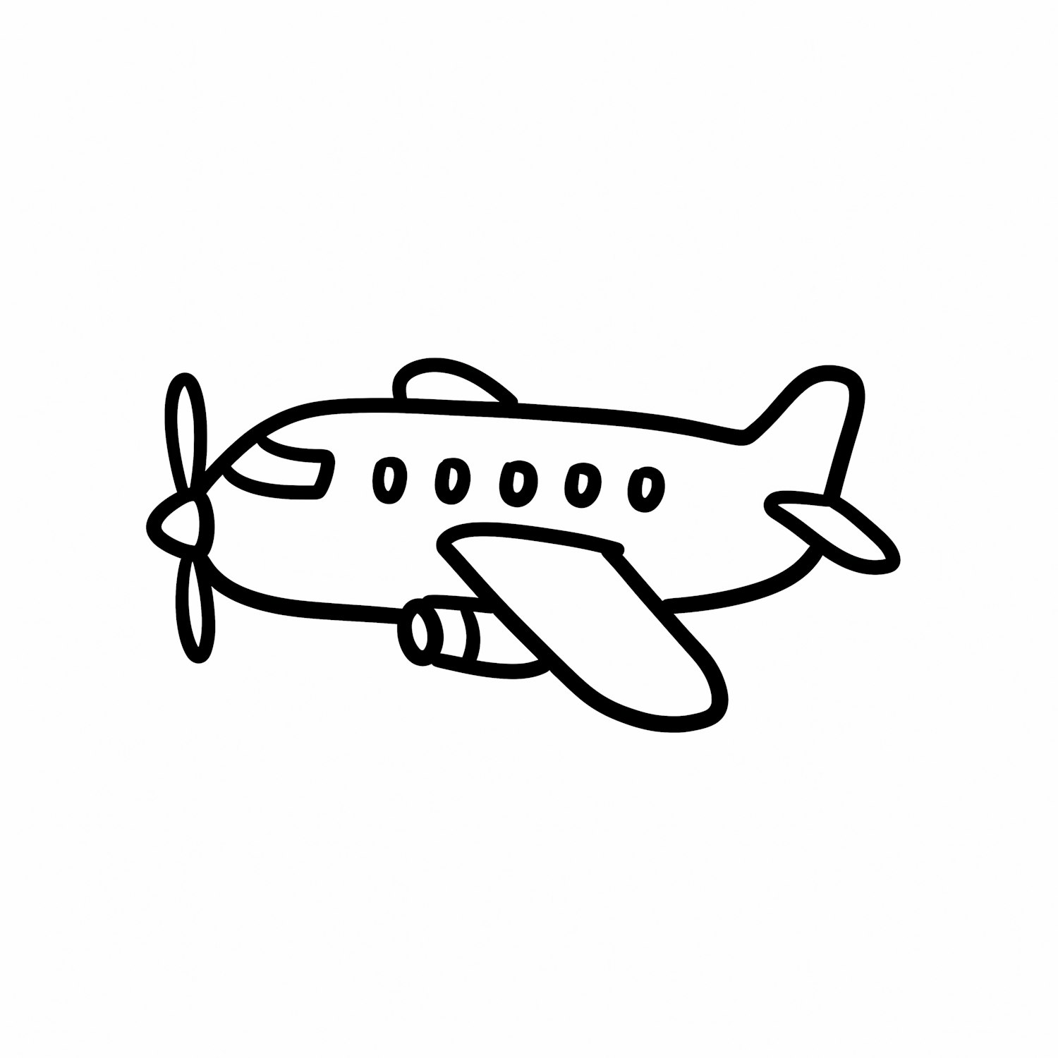 Minimalistic black-and-white line drawing of an airplane with a propeller, cockpit, and passenger windows.
