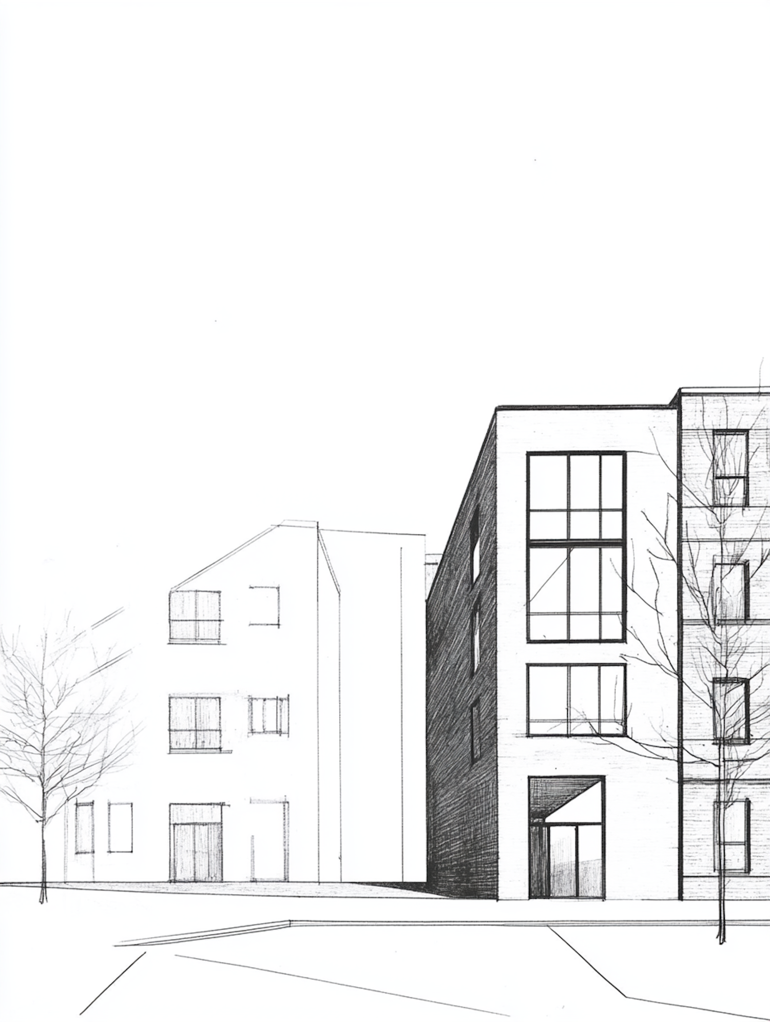 Minimalist architectural sketch of modern buildings with large windows and bare trees, emphasizing clean lines and geometric shapes.