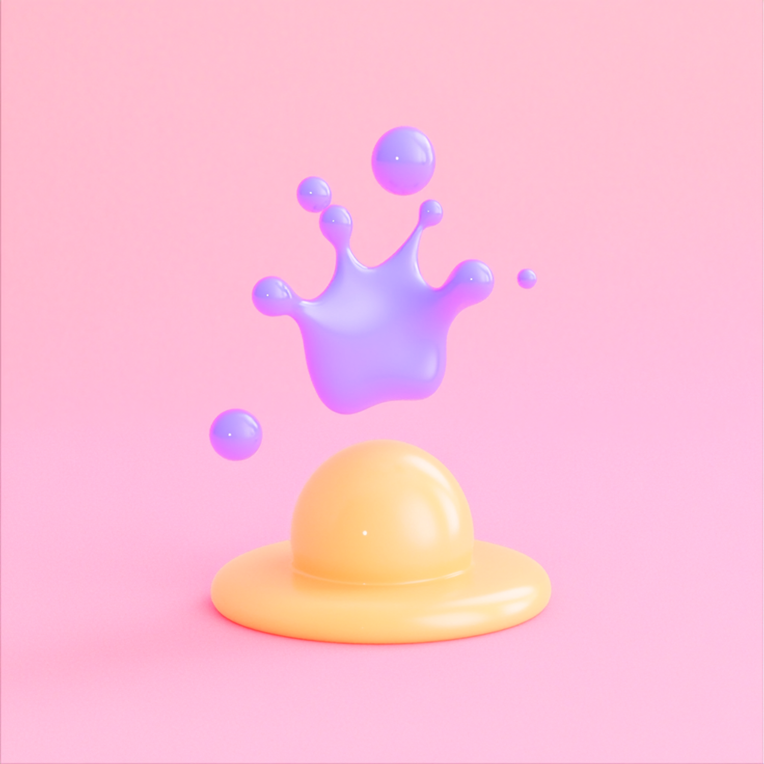 Colorful 3D splash with purple droplets and a yellow dome on a pink background, creating a playful and modern abstract scene.