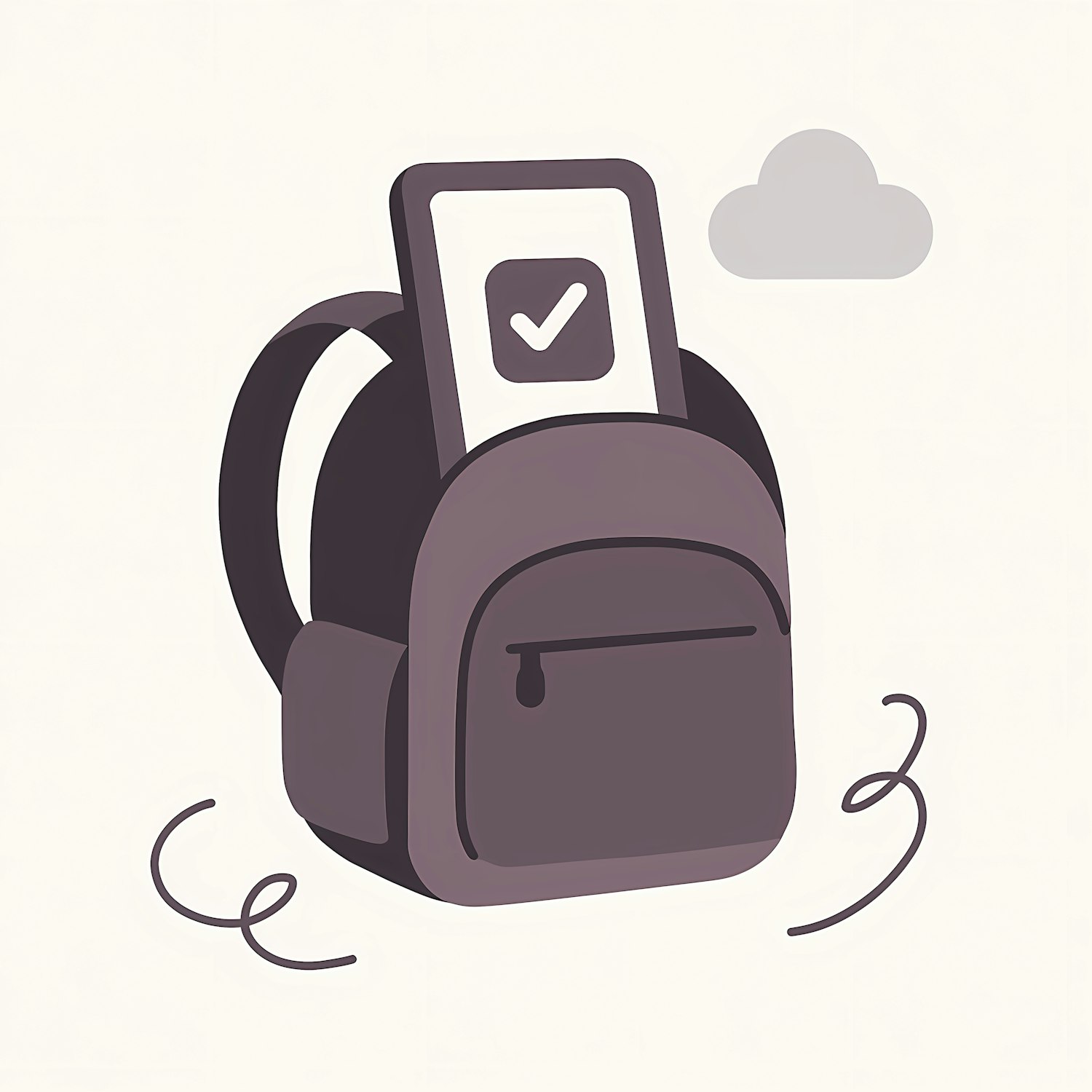 Minimalist illustration of a purple backpack with a phone showing a checkmark, set against a light beige background with a cloud icon.