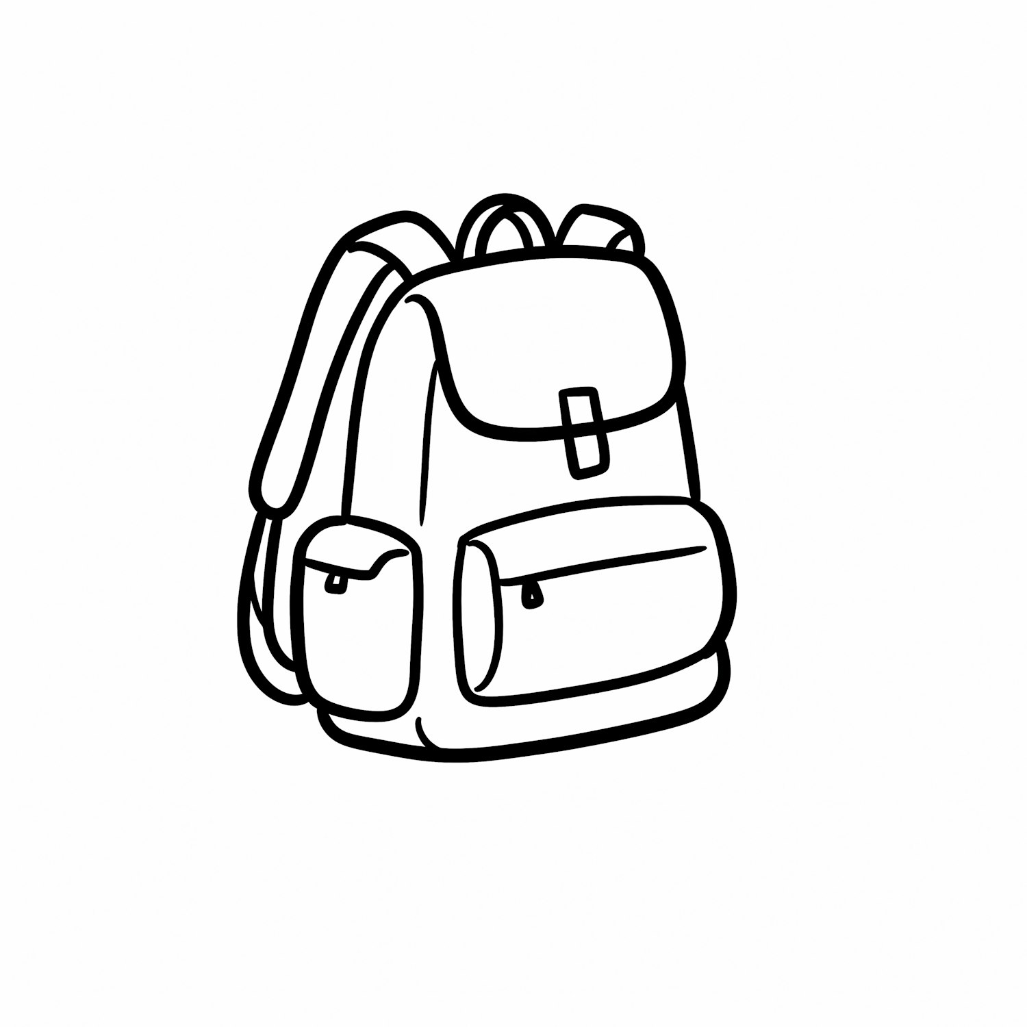 Minimalist black-and-white line drawing of a backpack with multiple compartments and a simple design.