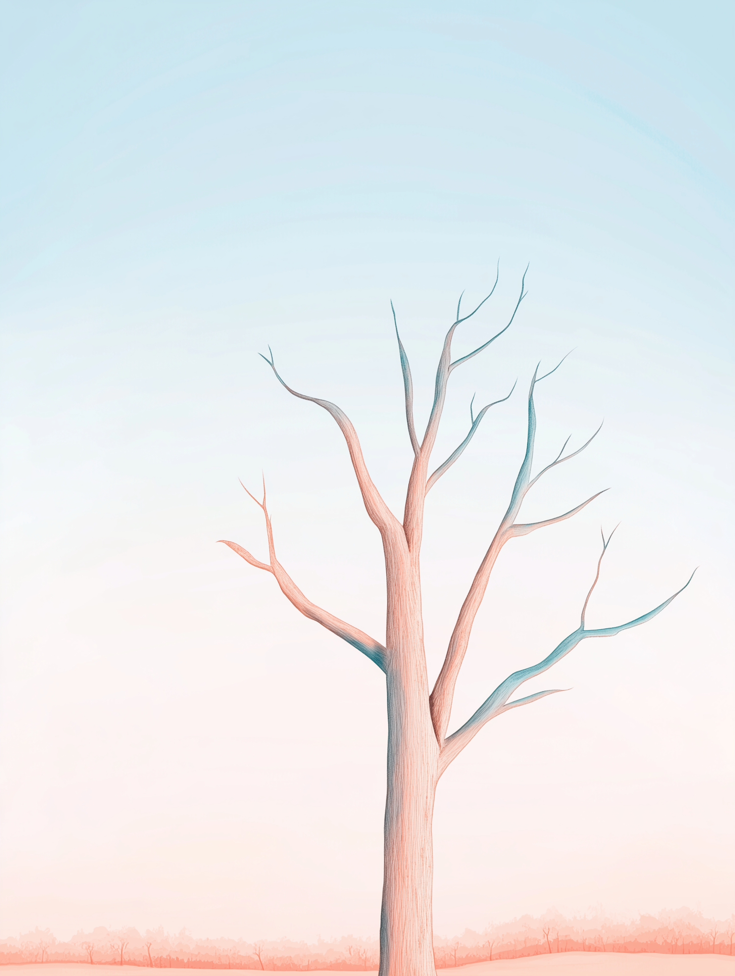 Minimalist illustration of a barren tree against a pastel gradient sky, evoking serenity and solitude with soft hues and sparse branches.