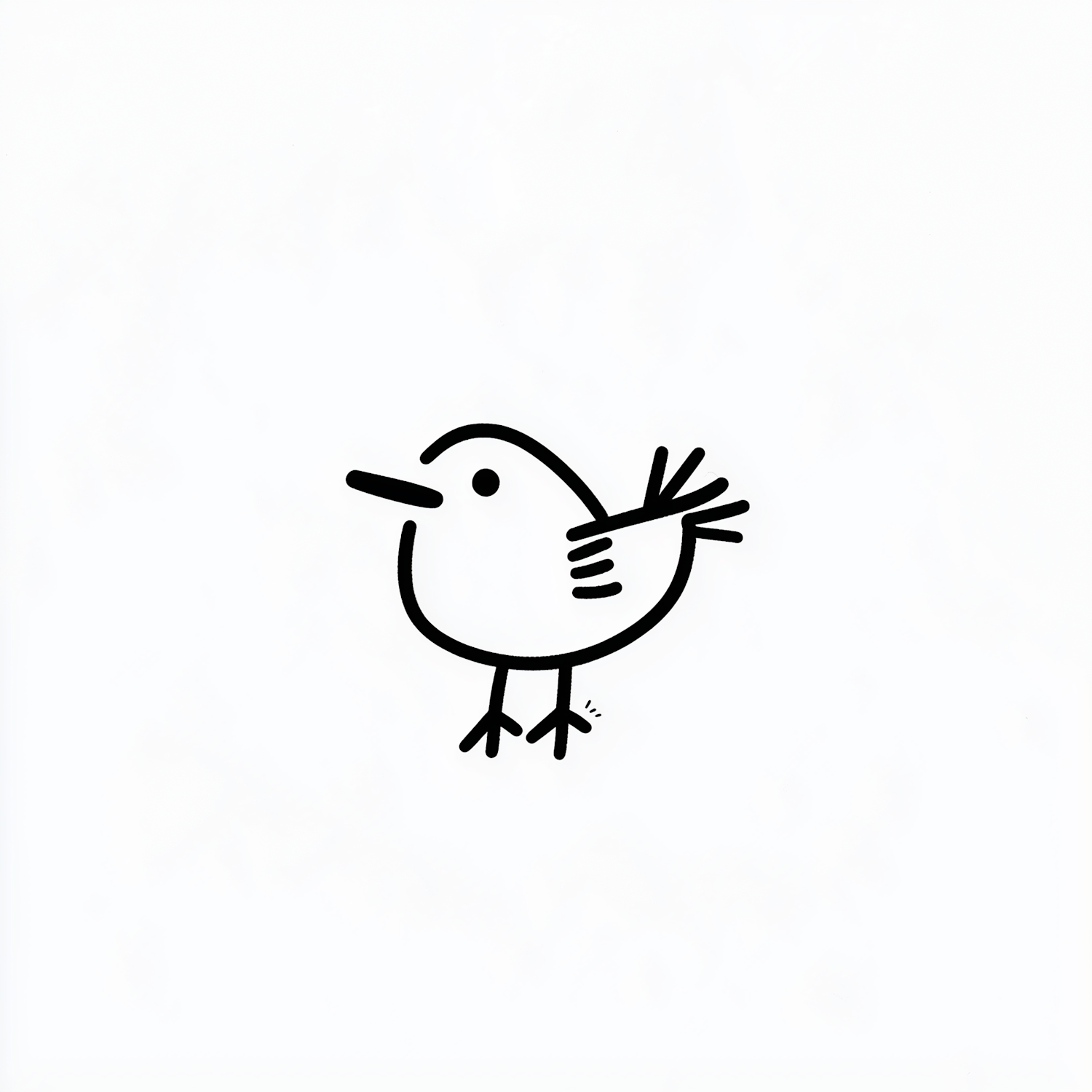 Minimalist black-and-white cartoon bird illustration with a rounded body, small beak, and stick legs on a plain white background.