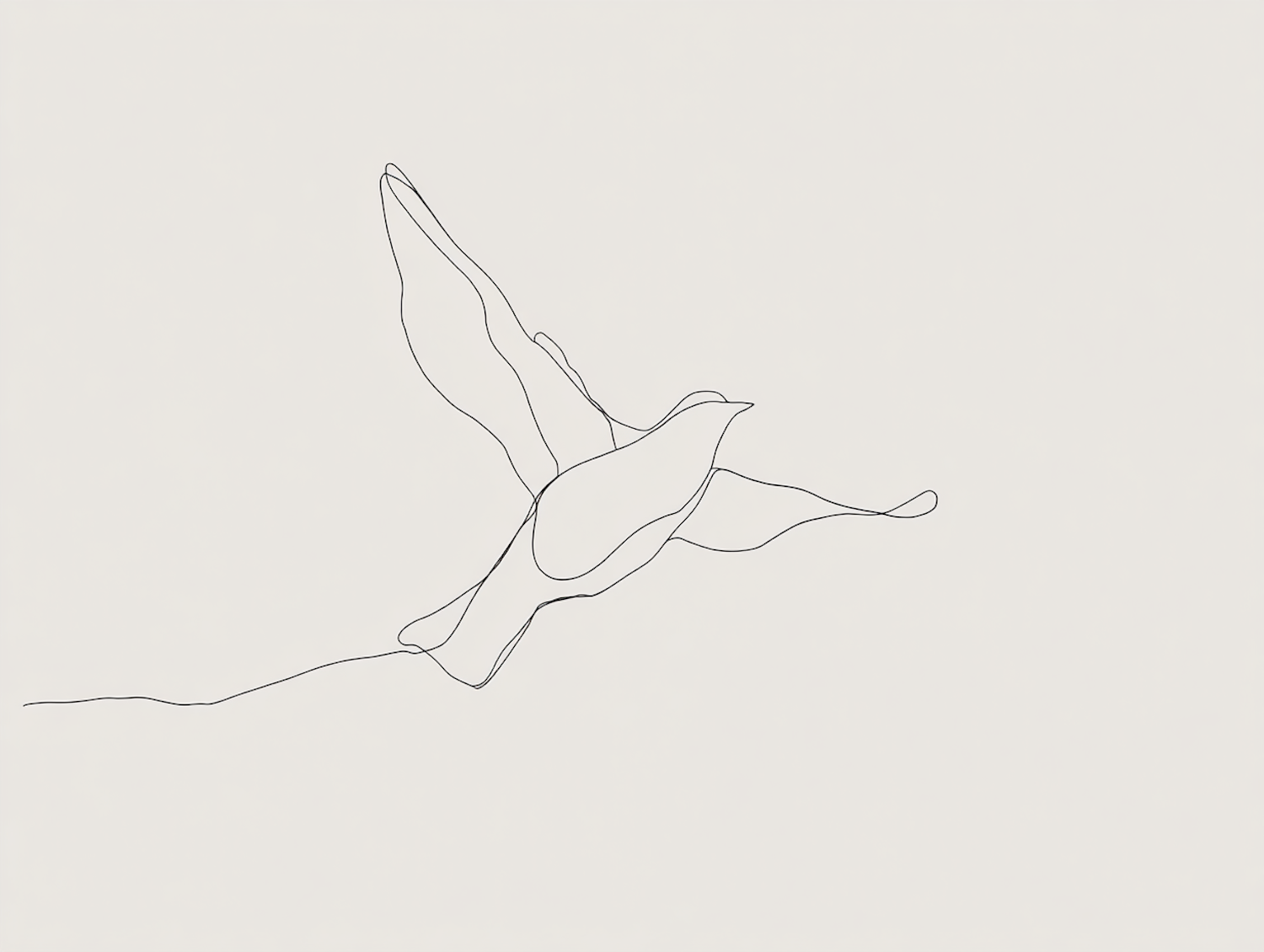 Minimalist line drawing of a bird mid-flight, crafted using continuous lines, on a neutral background for an elegant and serene touch.