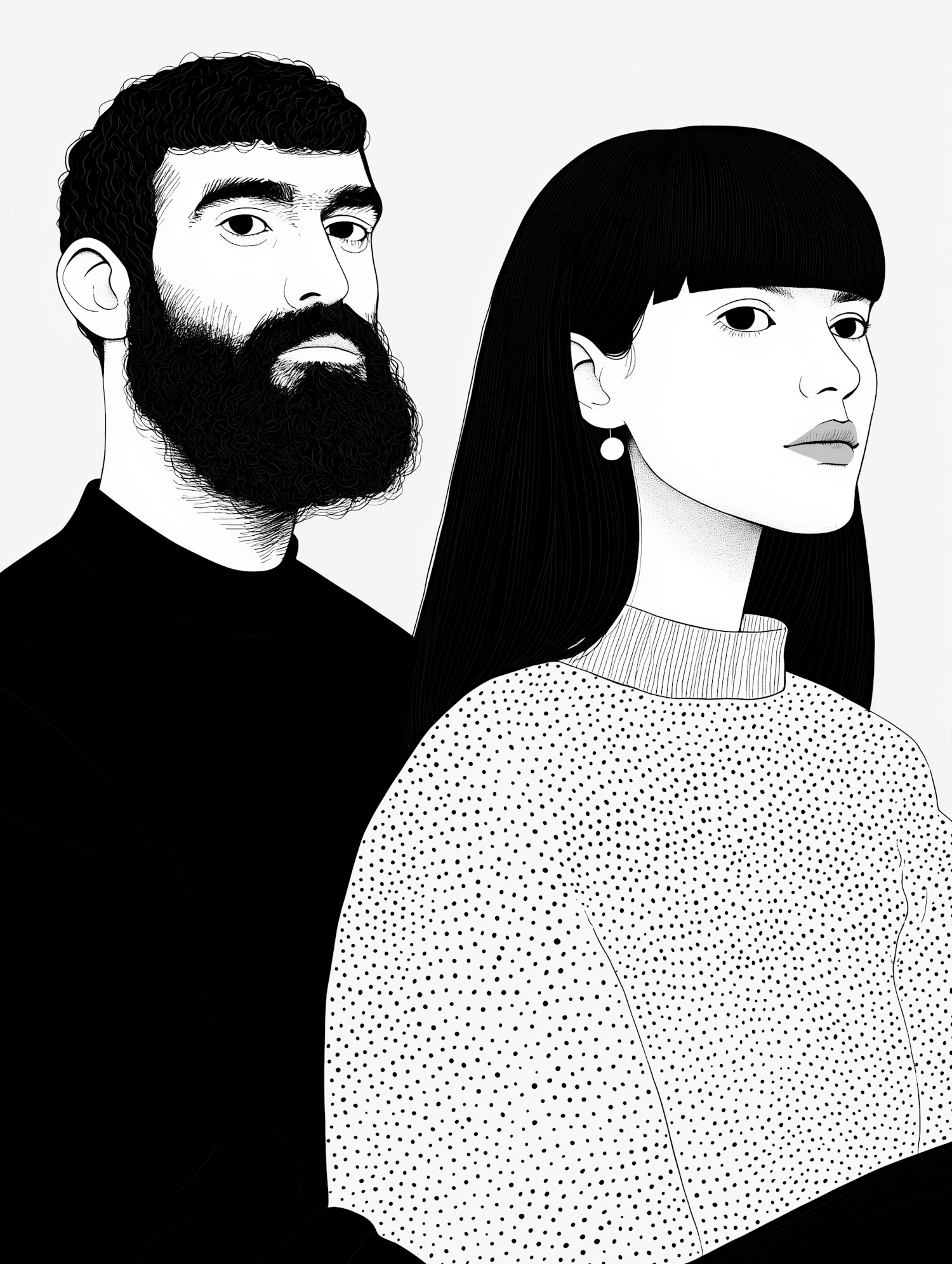 Stylish black and white illustration of a bearded man and a woman with bangs, showcasing minimalist design and fashion.