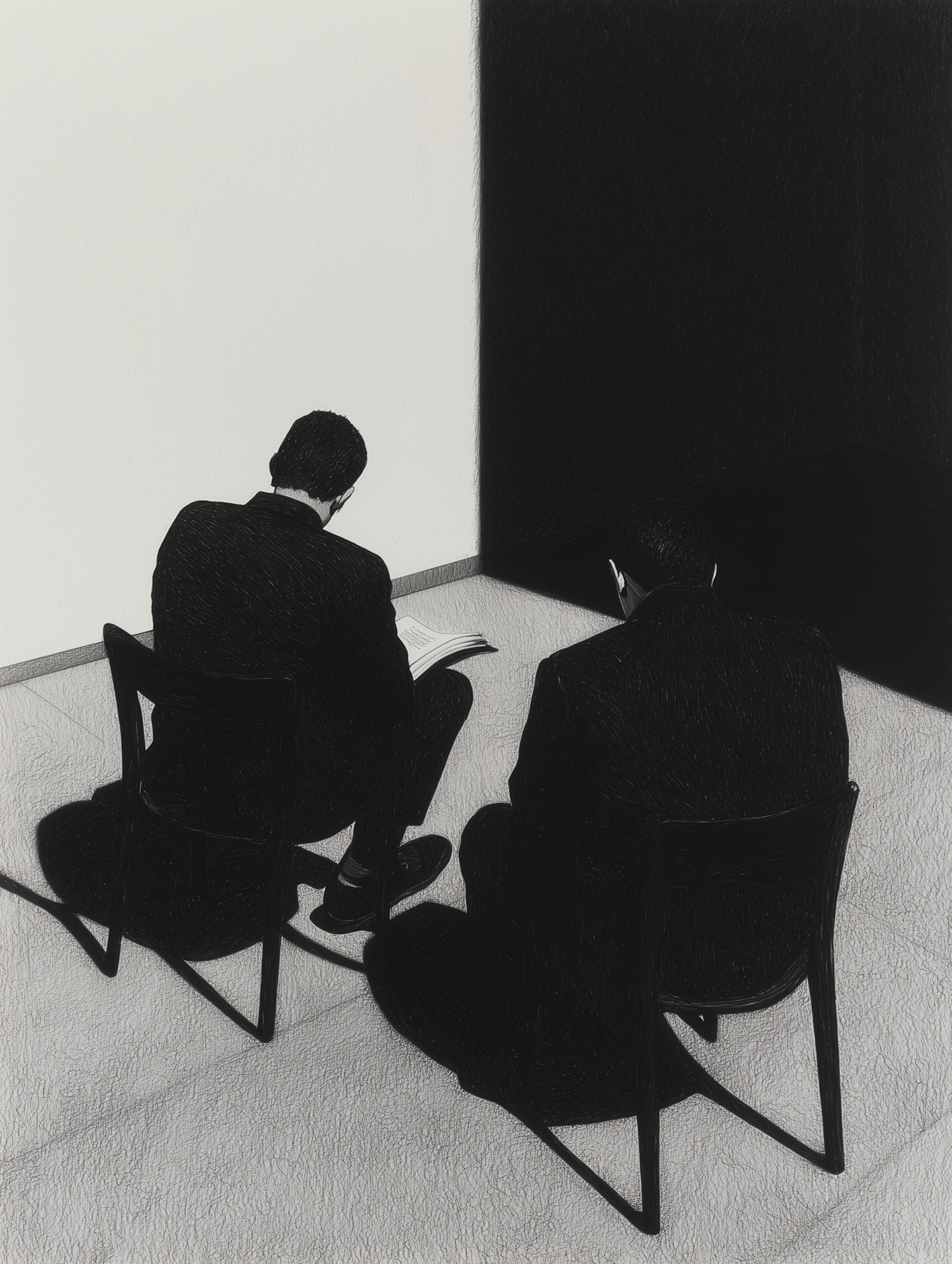 Two men in suits sit in a minimalist room with stark light and shadow contrast, creating a dramatic and contemplative scene.
