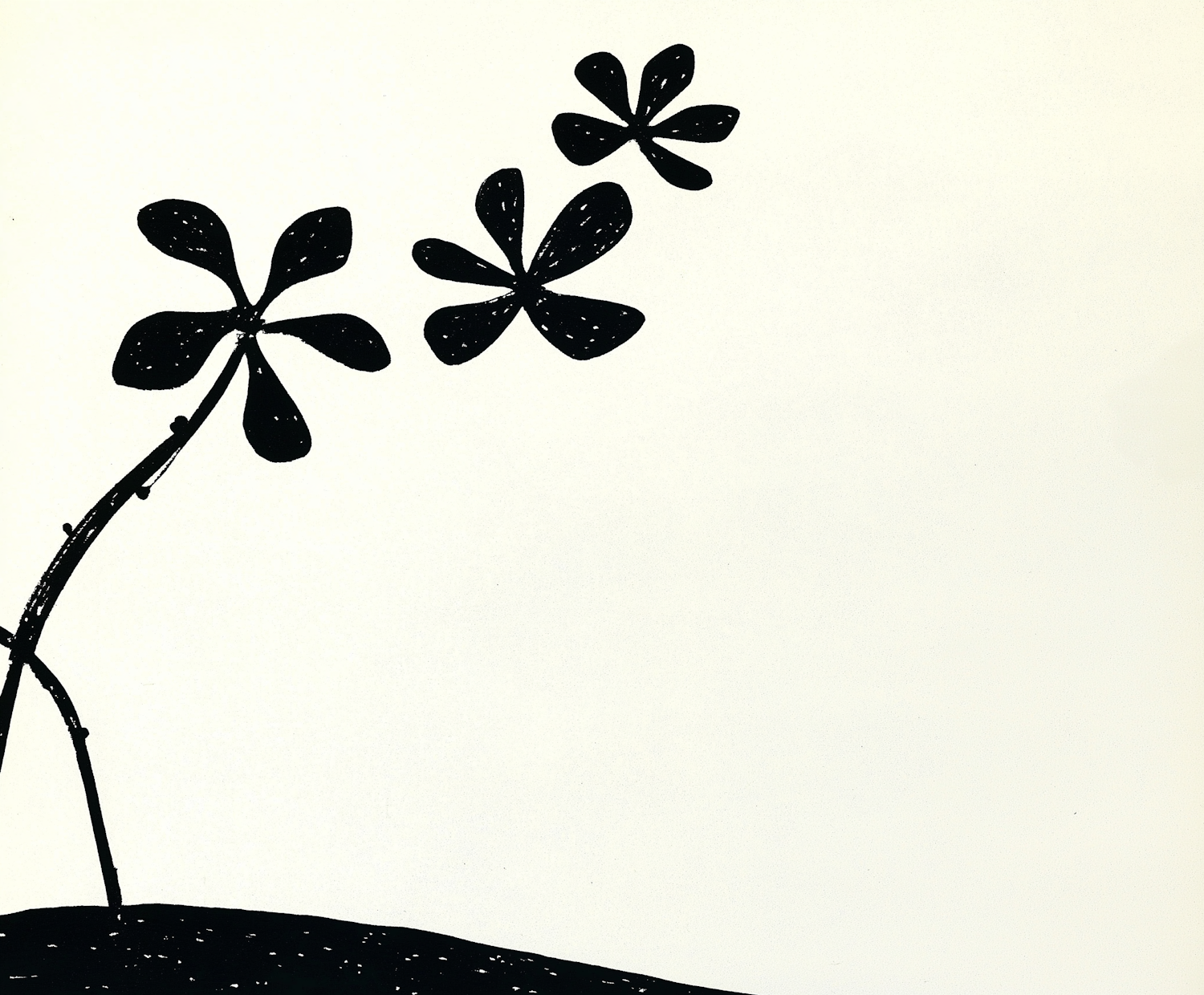Minimalist black and white illustration of a stylized plant with three abstract flowers on a plain background.
