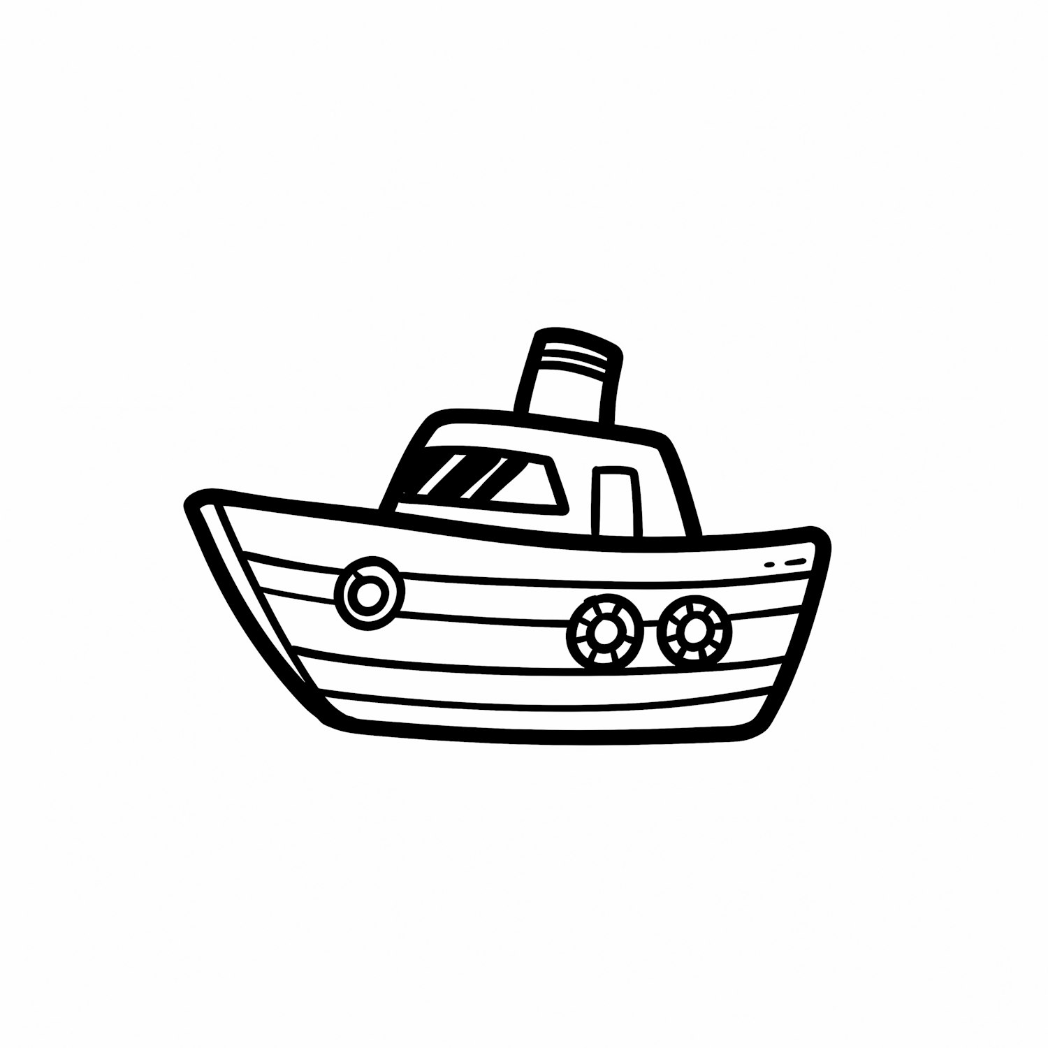A clean black-and-white line art of a boat with a chimney and circular windows, perfect for coloring or design projects.