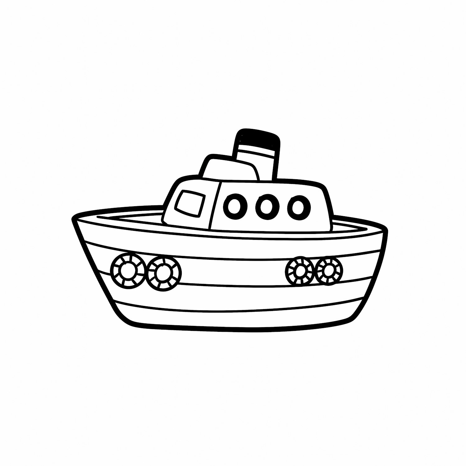 Black-and-white line drawing of a boat with a cabin, circular windows, and life preservers, perfect for coloring or educational use.