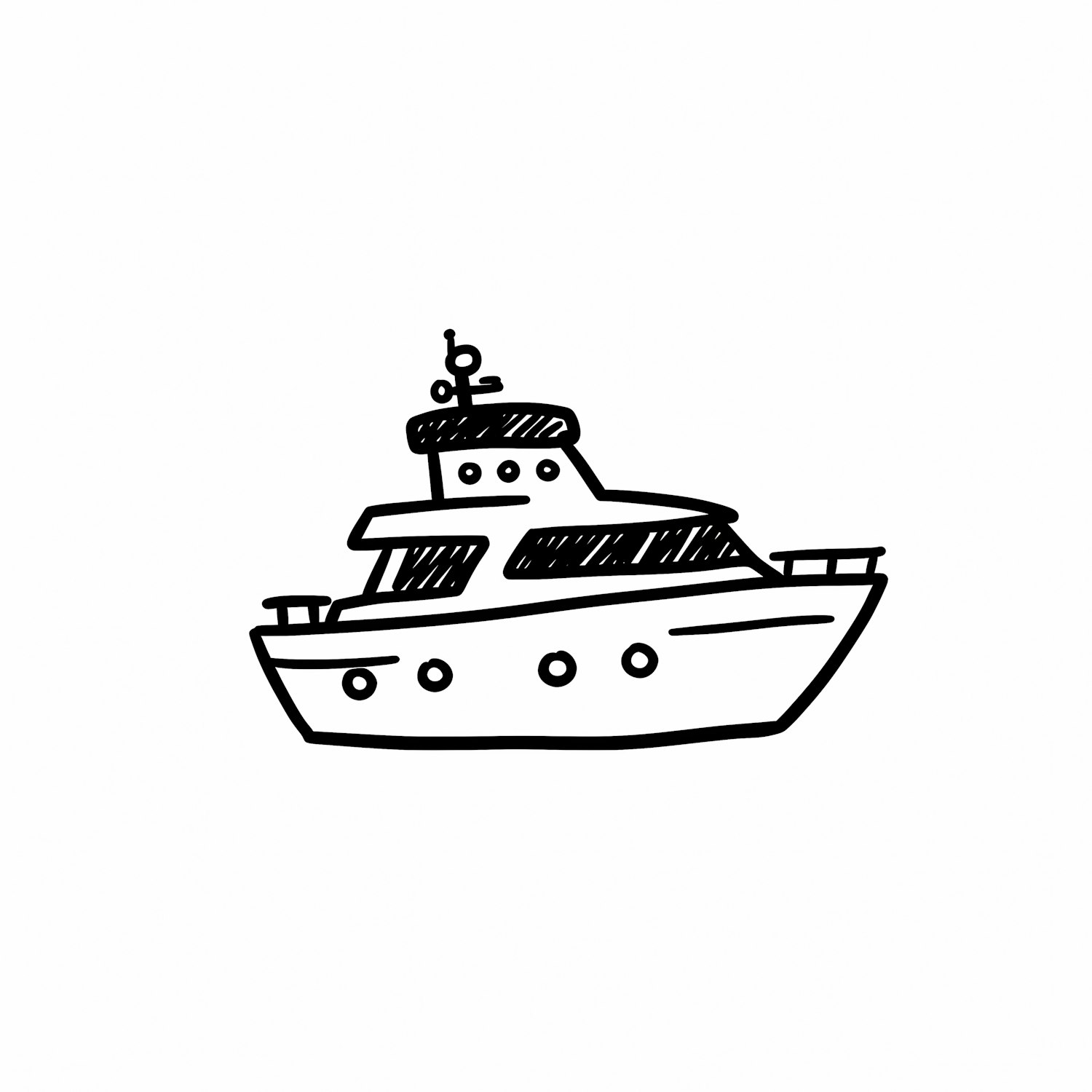 Minimalistic black-and-white line drawing of a boat with a multi-level design and windows, set against a plain white background.