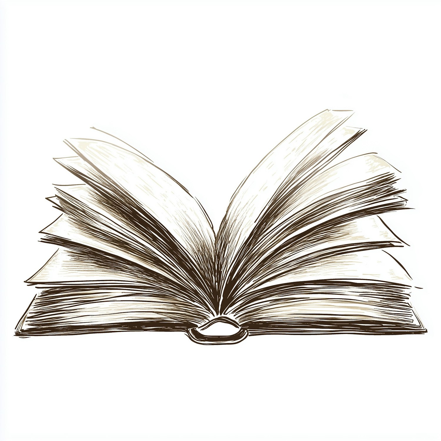 Sketch-style illustration of an open book with fanned pages on a white background, perfect for literary or educational themes.
