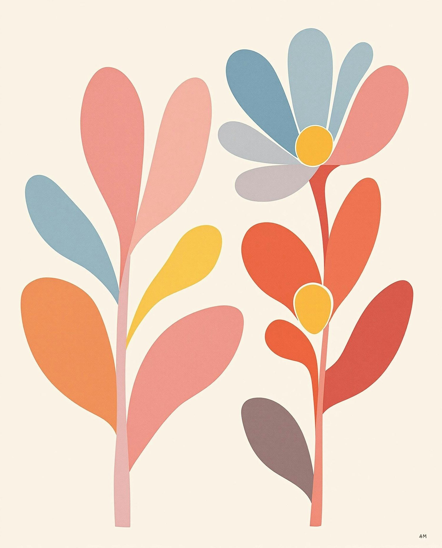 Stylized floral design in pinks, oranges, blues, and yellows against a beige background, ideal for abstract artistic decor.