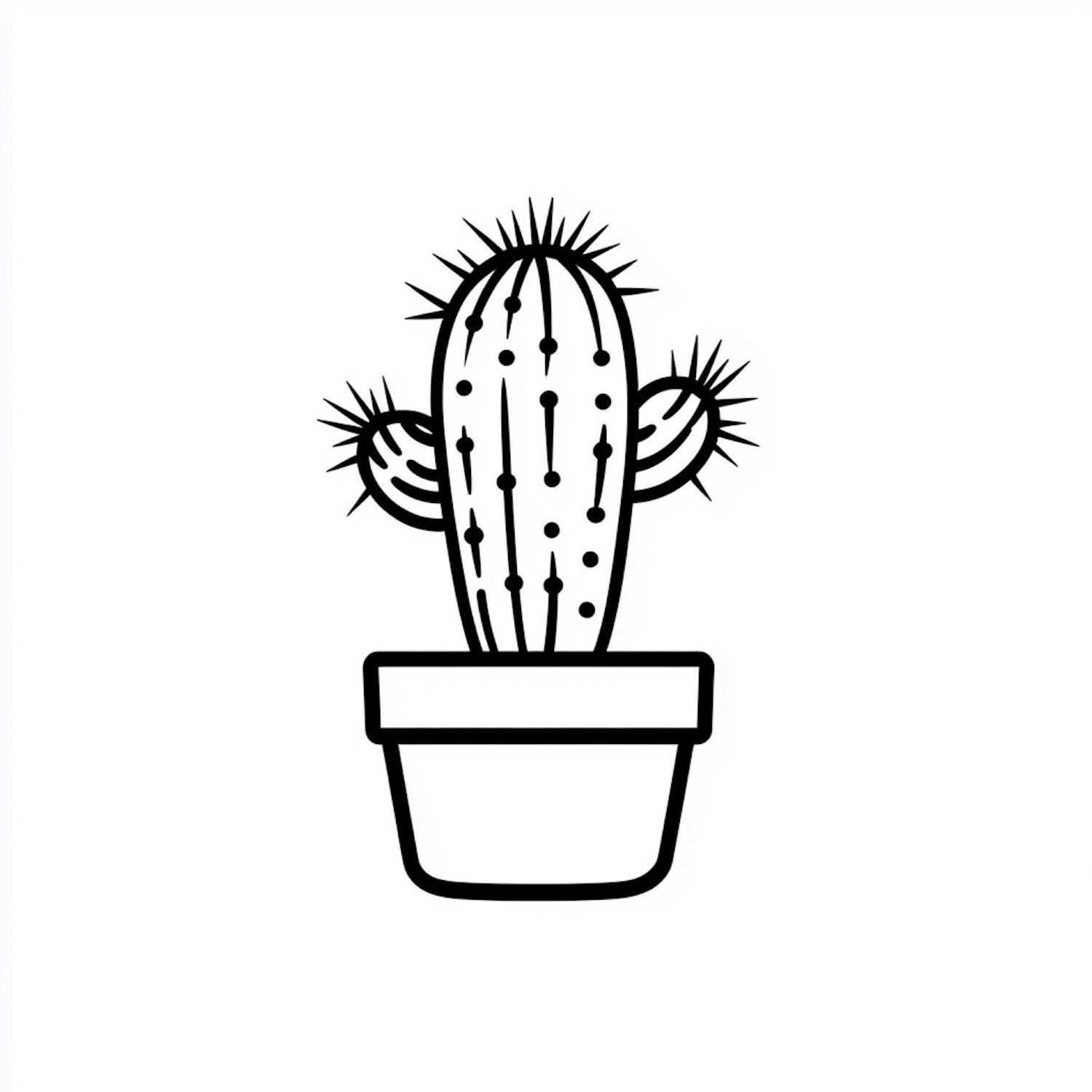 Minimalist black-and-white line art of a cactus in a pot, featuring a tall central column and two smaller arms with spines.