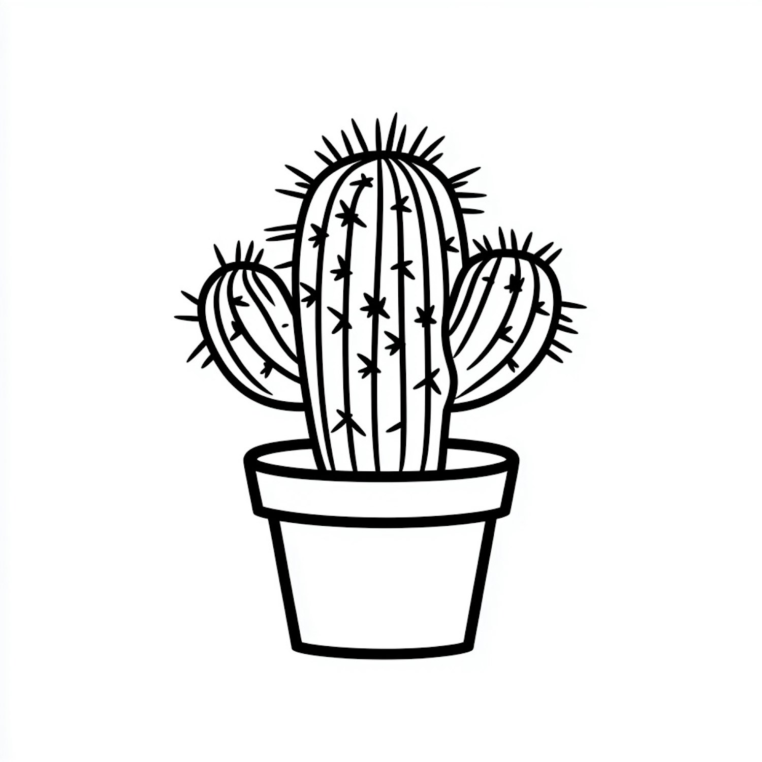 Minimalist black-and-white line art of a potted cactus with spines, perfect for coloring or simple design projects.