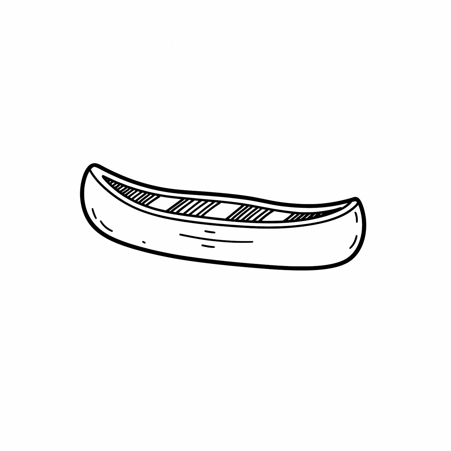 Minimalist black-and-white line drawing of a canoe, showcasing its elongated shape and curved ends with simple interior details.