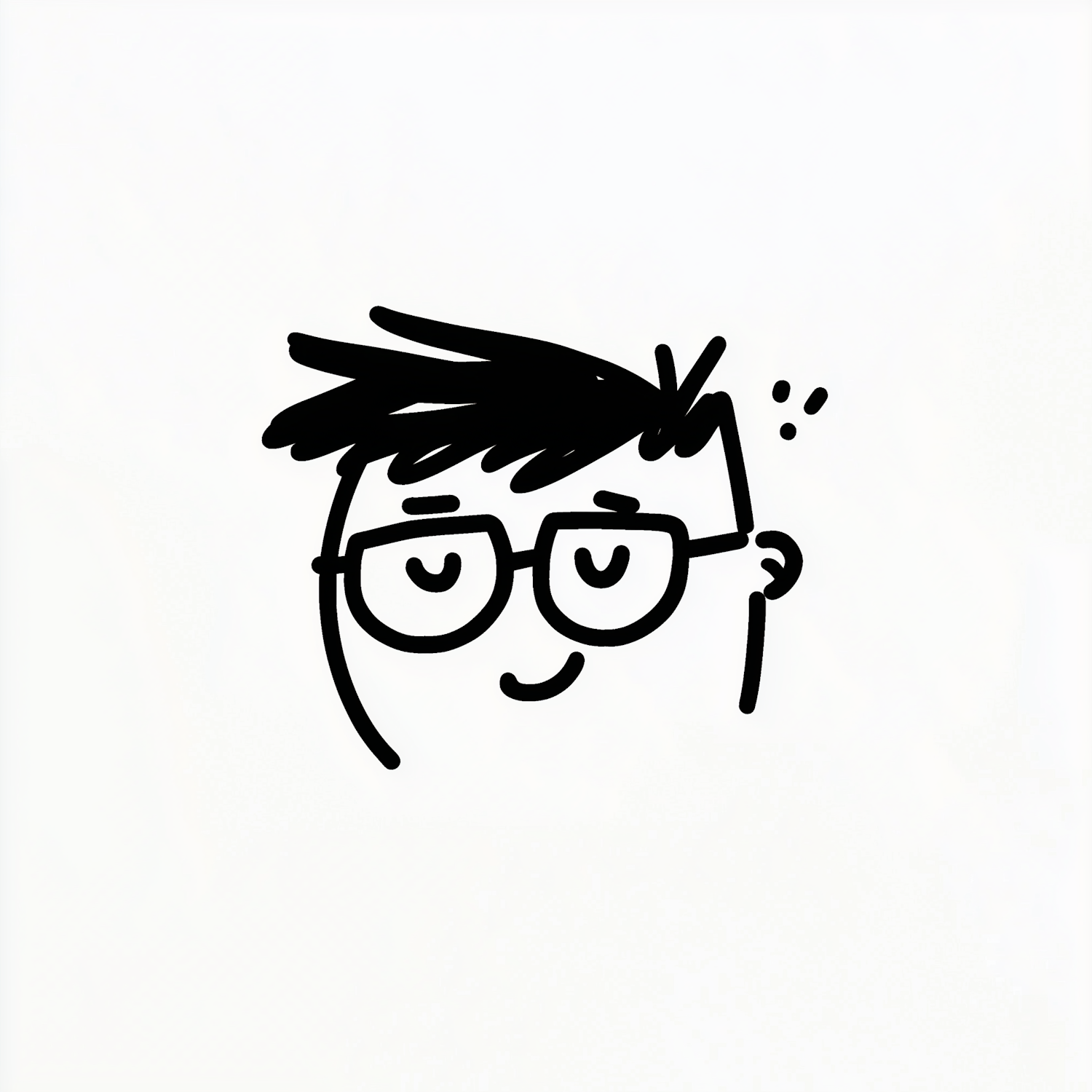 Minimalist cartoon face with spiky hair, glasses, and a cheerful smile on a clean white background. Simple and playful design.