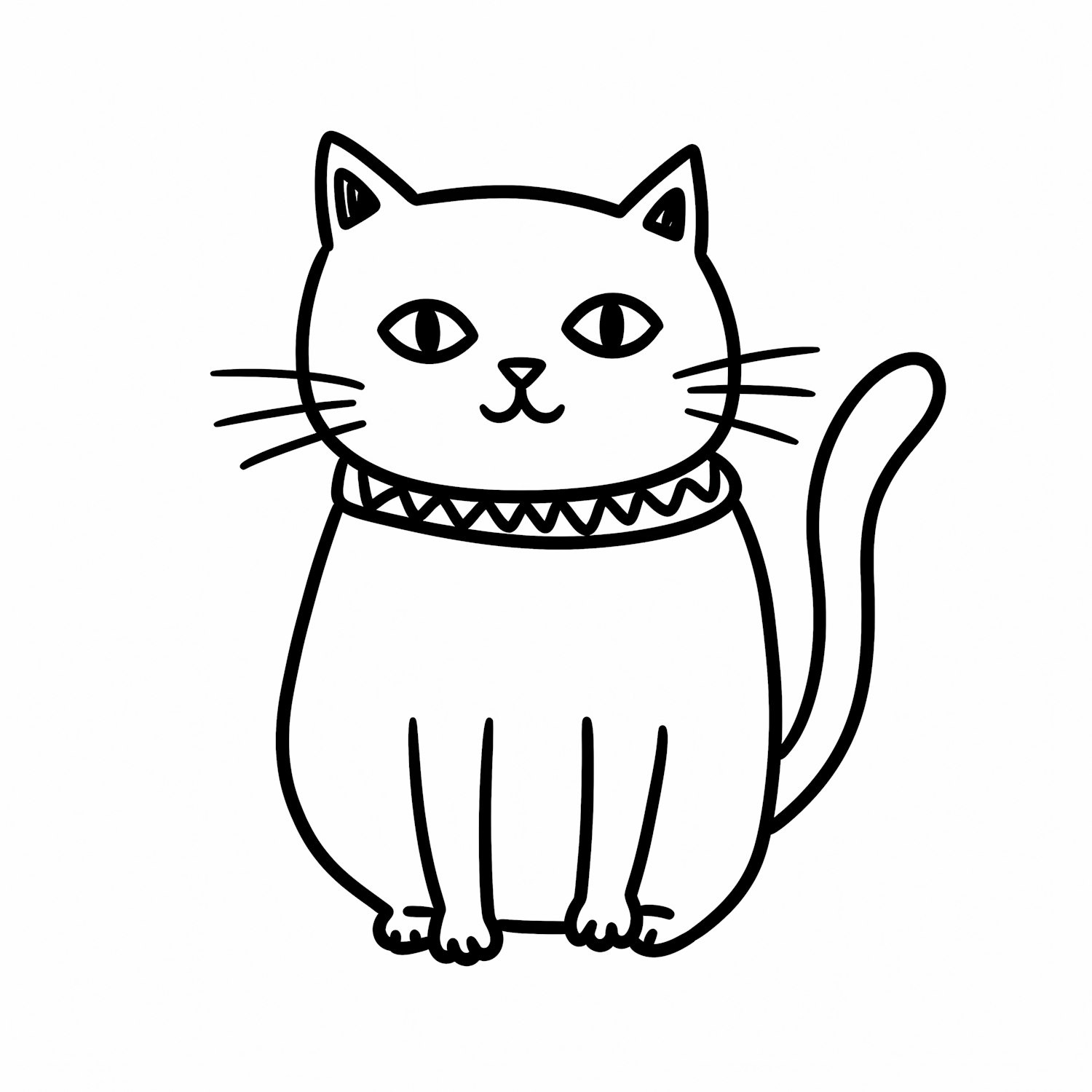 Minimalist black-and-white line drawing of a sitting cat with a zigzag collar, perfect for coloring or simple design projects.