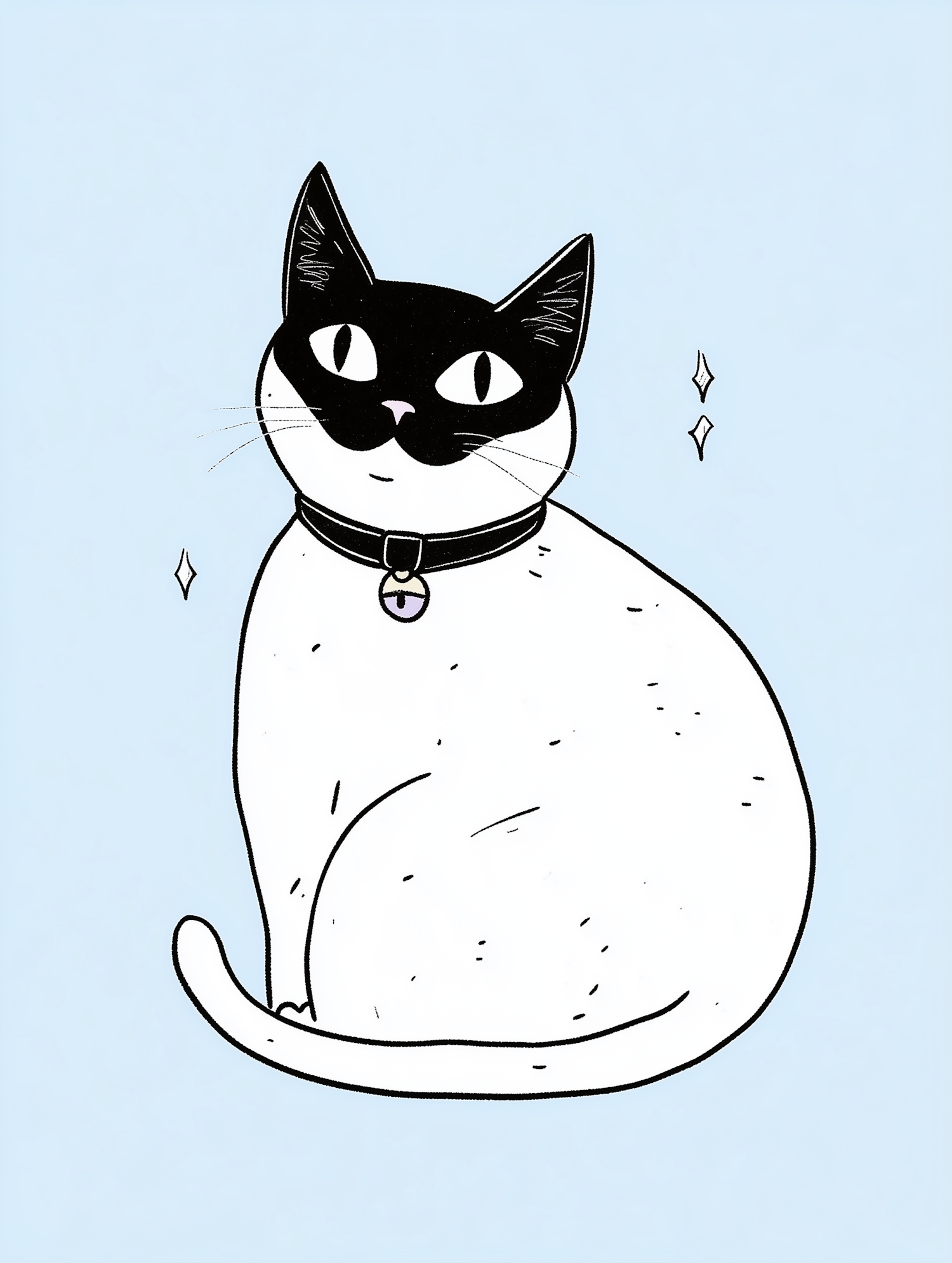 Minimalist black-and-white cat illustration with a whimsical touch, featuring a bell collar and sparkles on a light blue background.