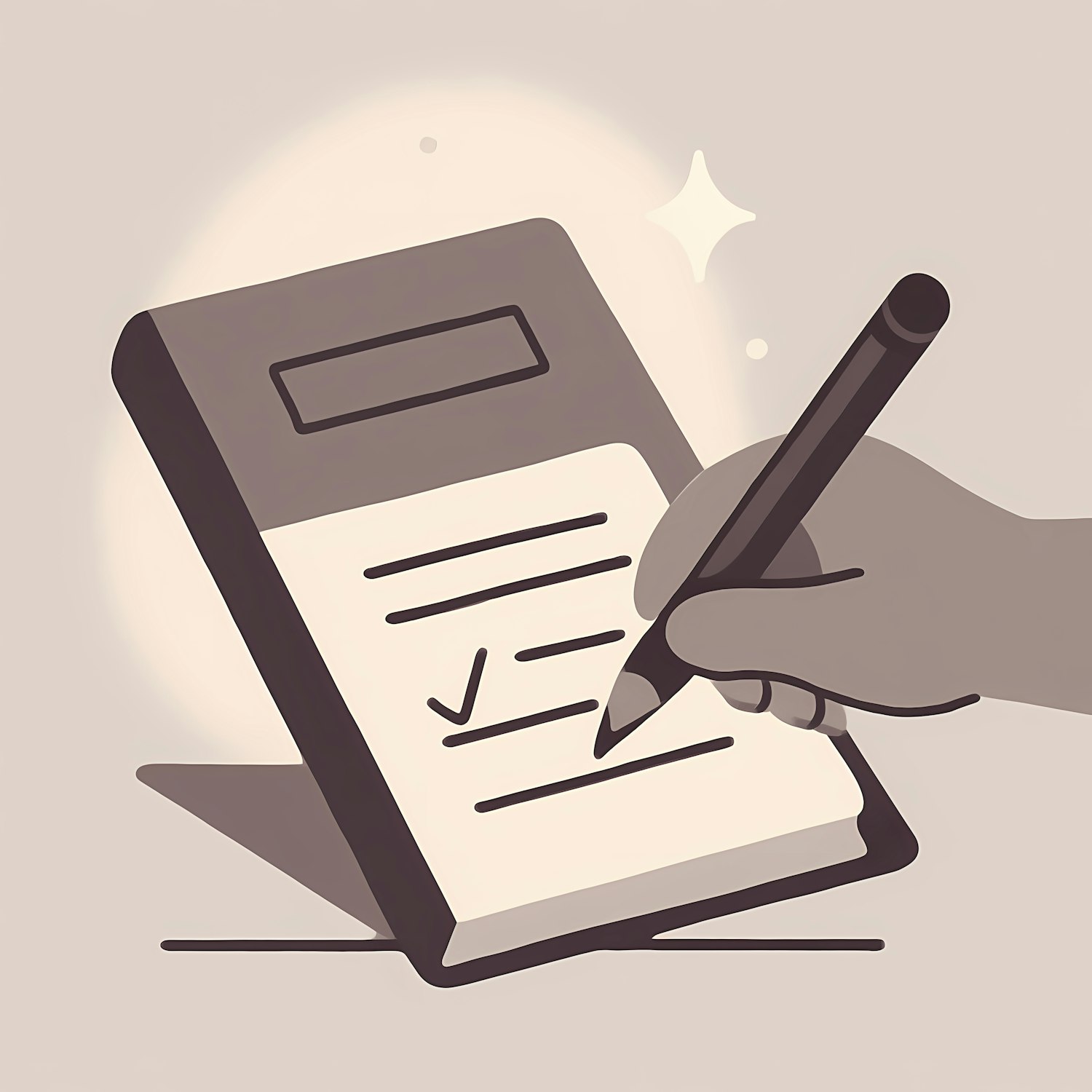 Minimalist grayscale illustration of a hand marking a checklist with a pen, symbolizing productivity and task completion.