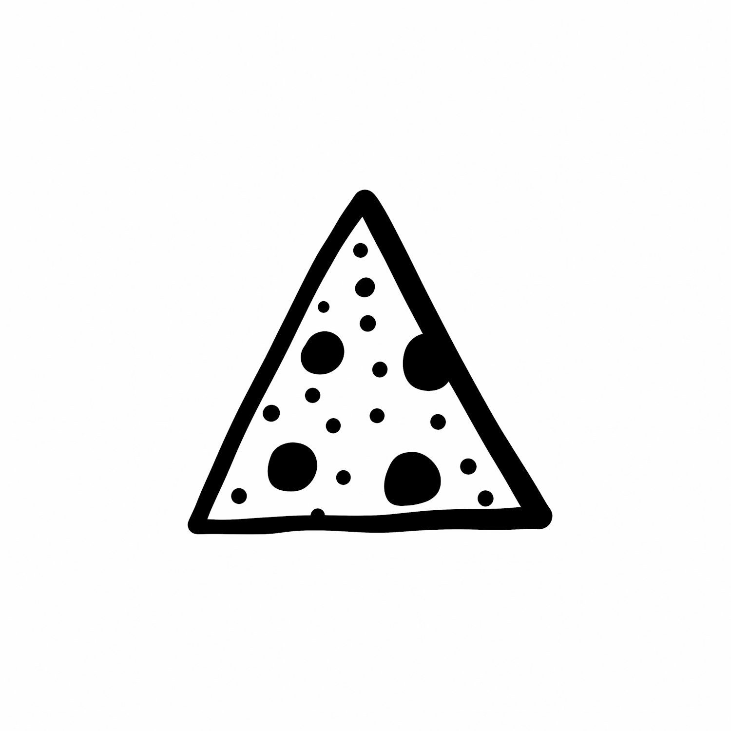 Minimalist black and white illustration of a triangular cheese slice with circular holes, perfect for simple design projects.