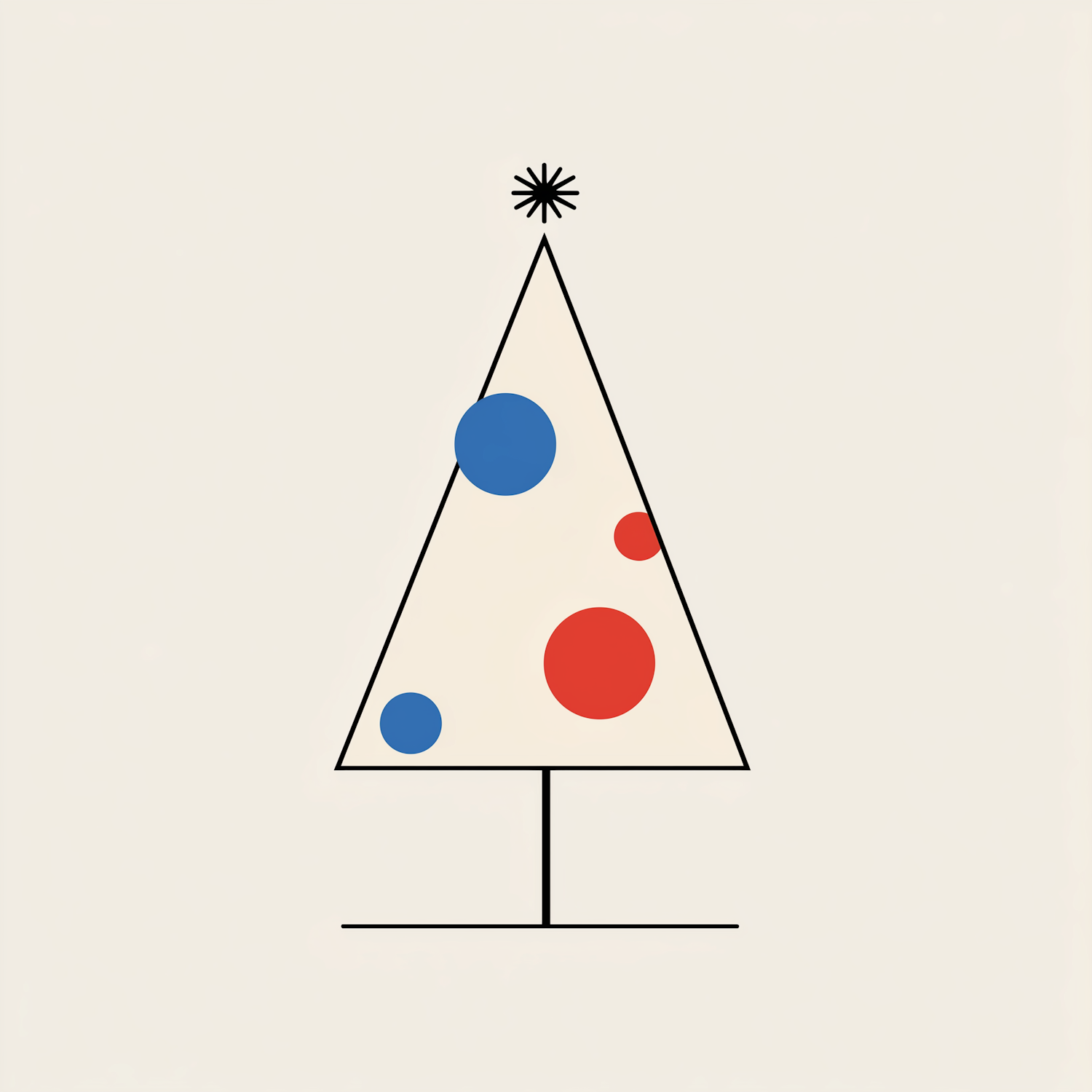 Minimalist Christmas tree illustration with geometric shapes, featuring blue and red ornaments on a beige background.