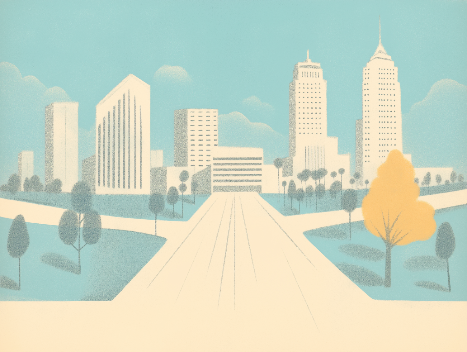 Minimalist cityscape illustration with modern skyscrapers, a wide road, green spaces, and a standout yellow tree under a pastel blue sky.