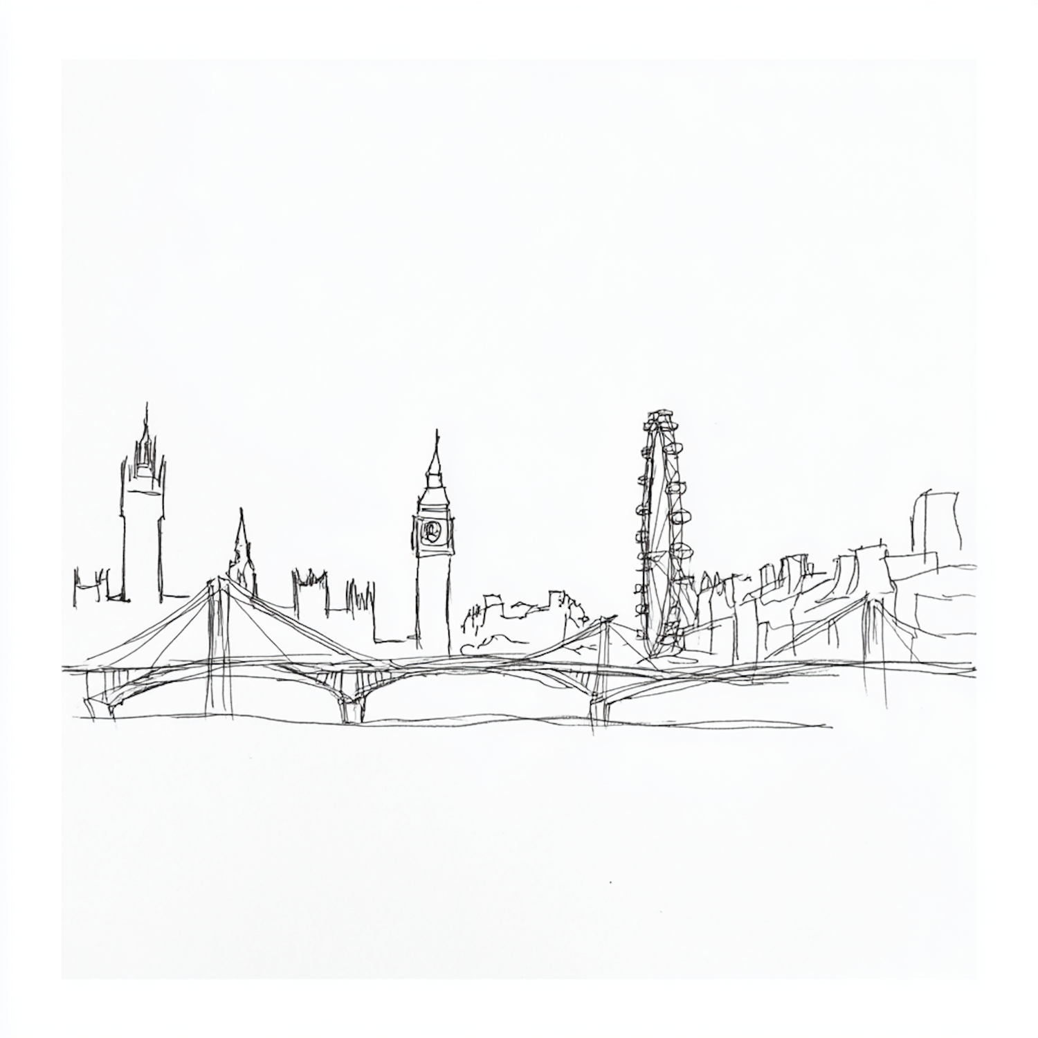 Minimalist line art of a cityscape with iconic landmarks like Big Ben and the London Eye, drawn in black ink on a white background.