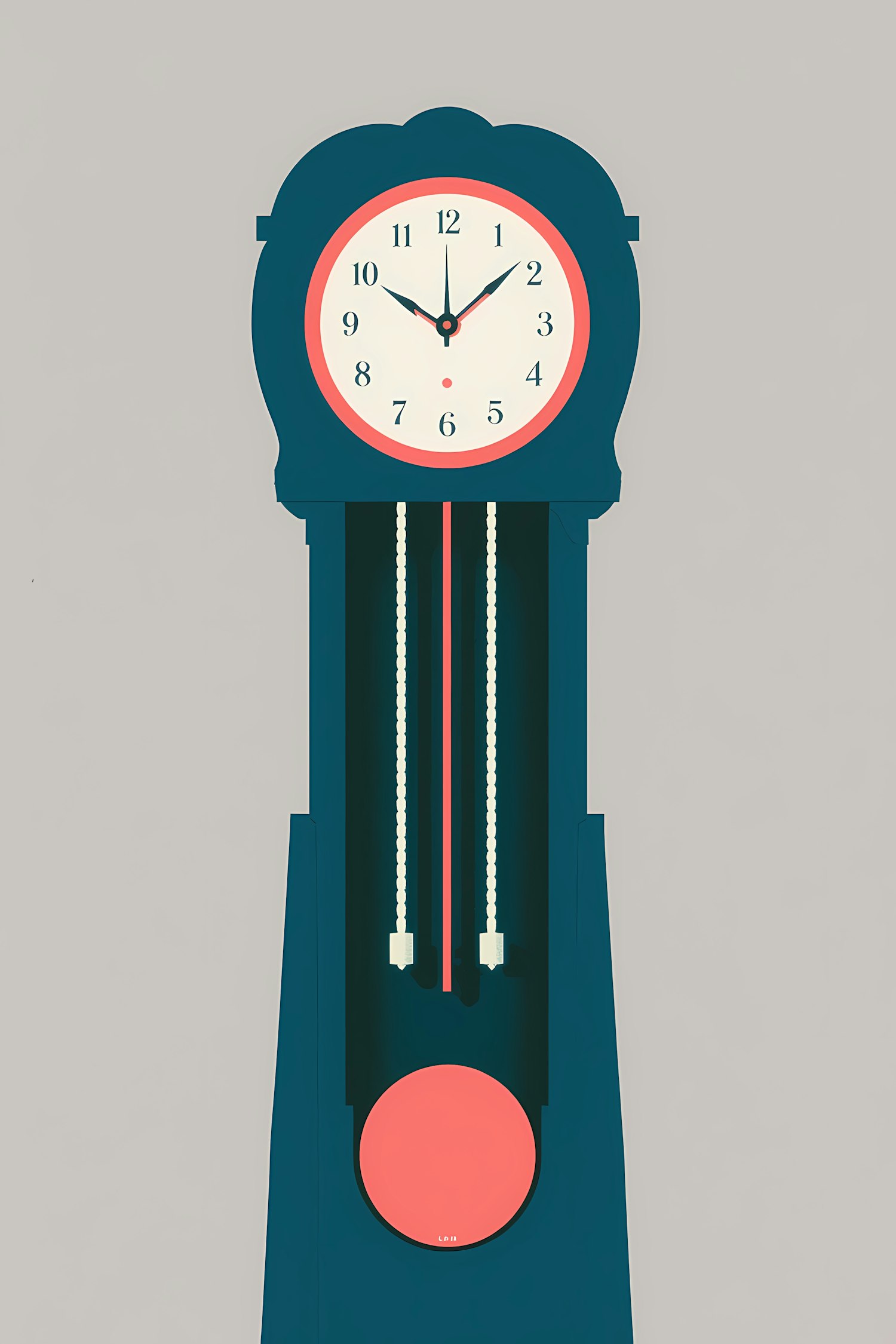 Minimalist illustration of a grandfather clock with a teal body, red pendulum, and a white clock face with black numerals.