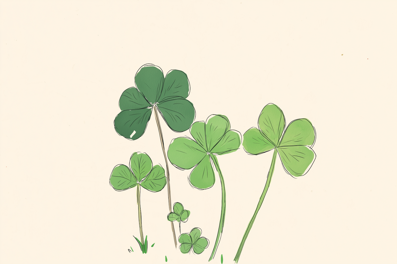 A charming illustration of three-leaf and four-leaf clovers on a beige background, perfect for nature or St. Patrick's Day themes.