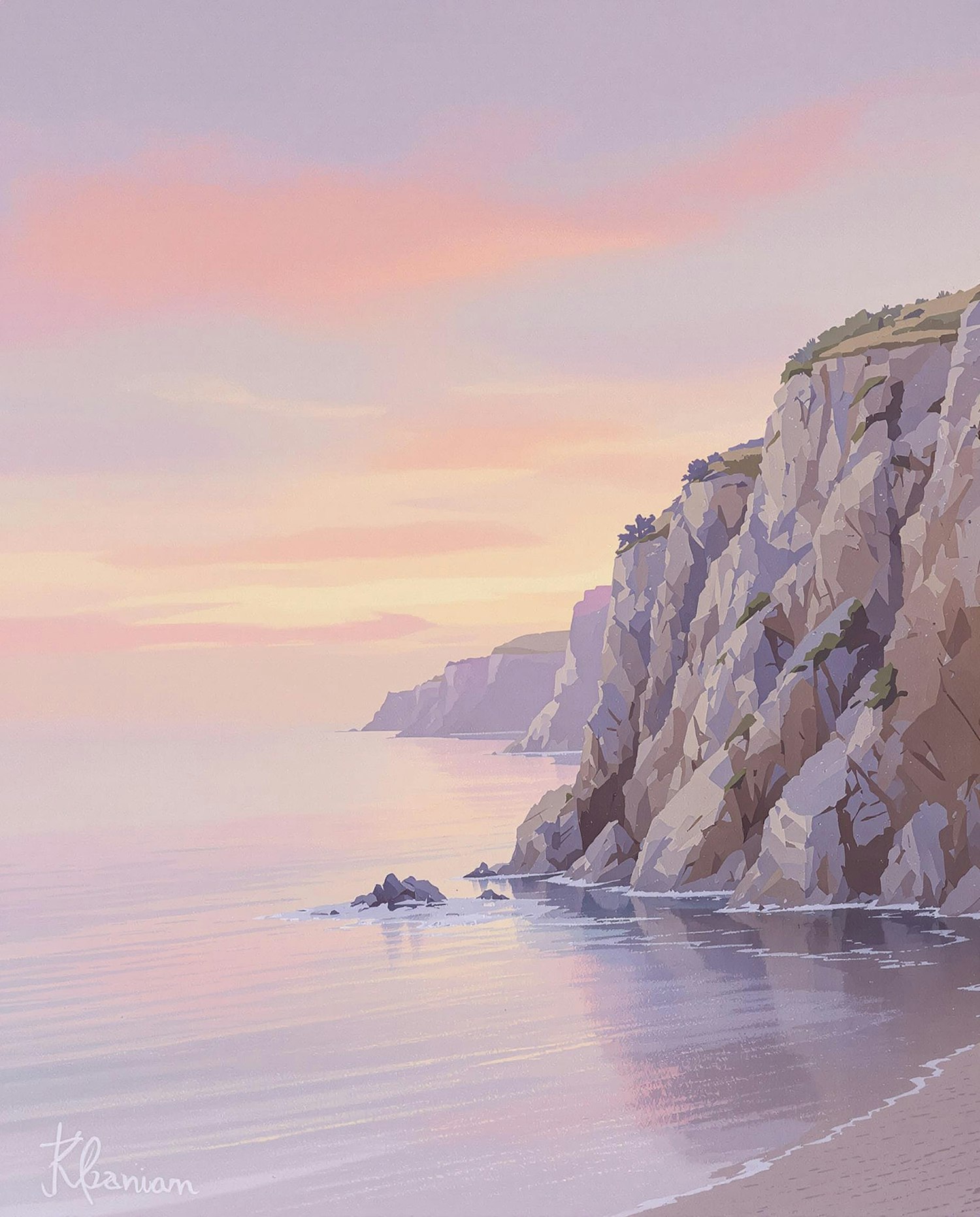 Beautiful pastel artwork of a serene coastal cliffscape with sunset hues reflecting on calm waters.
